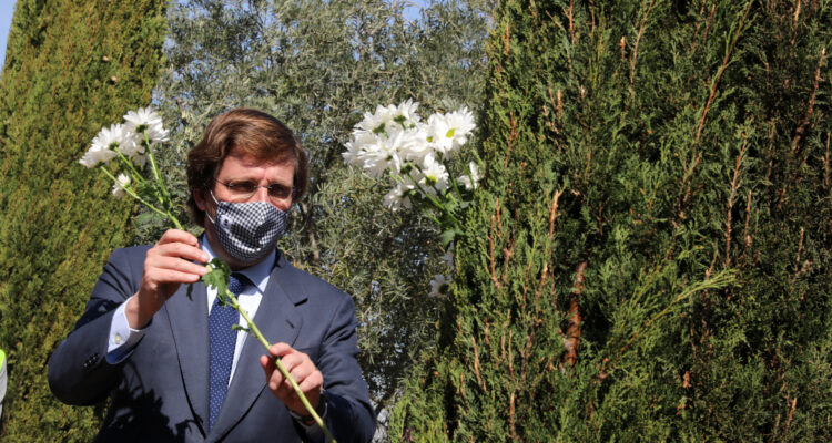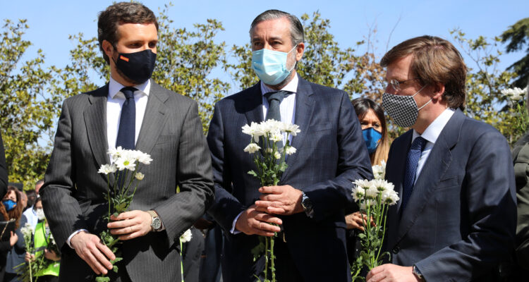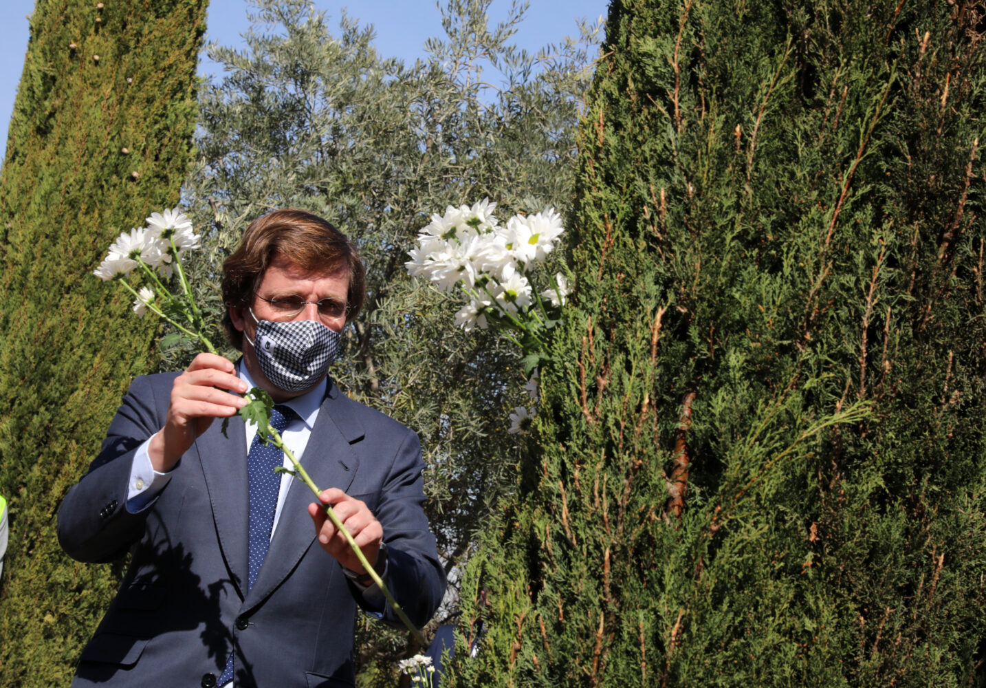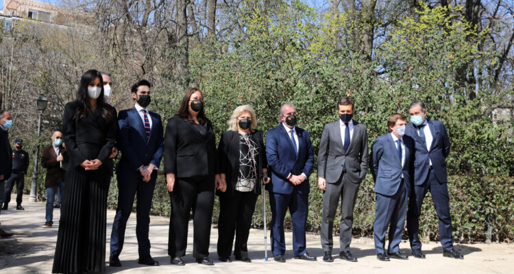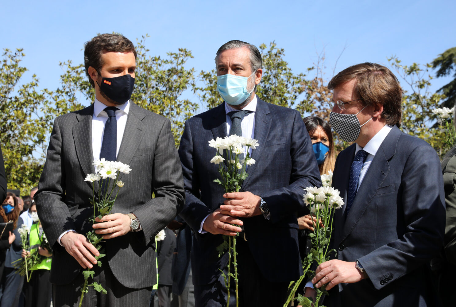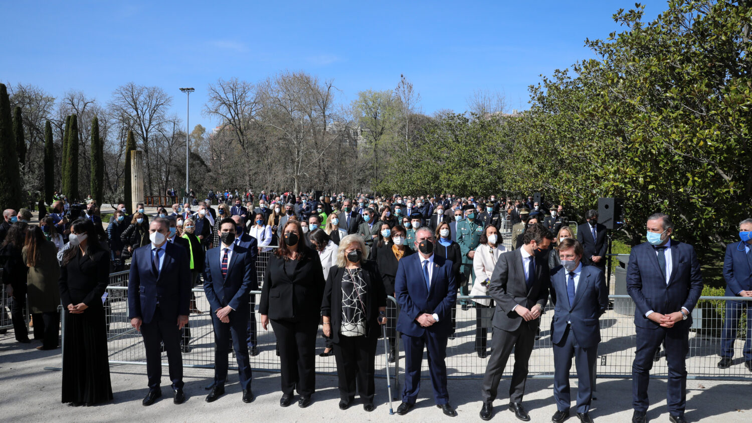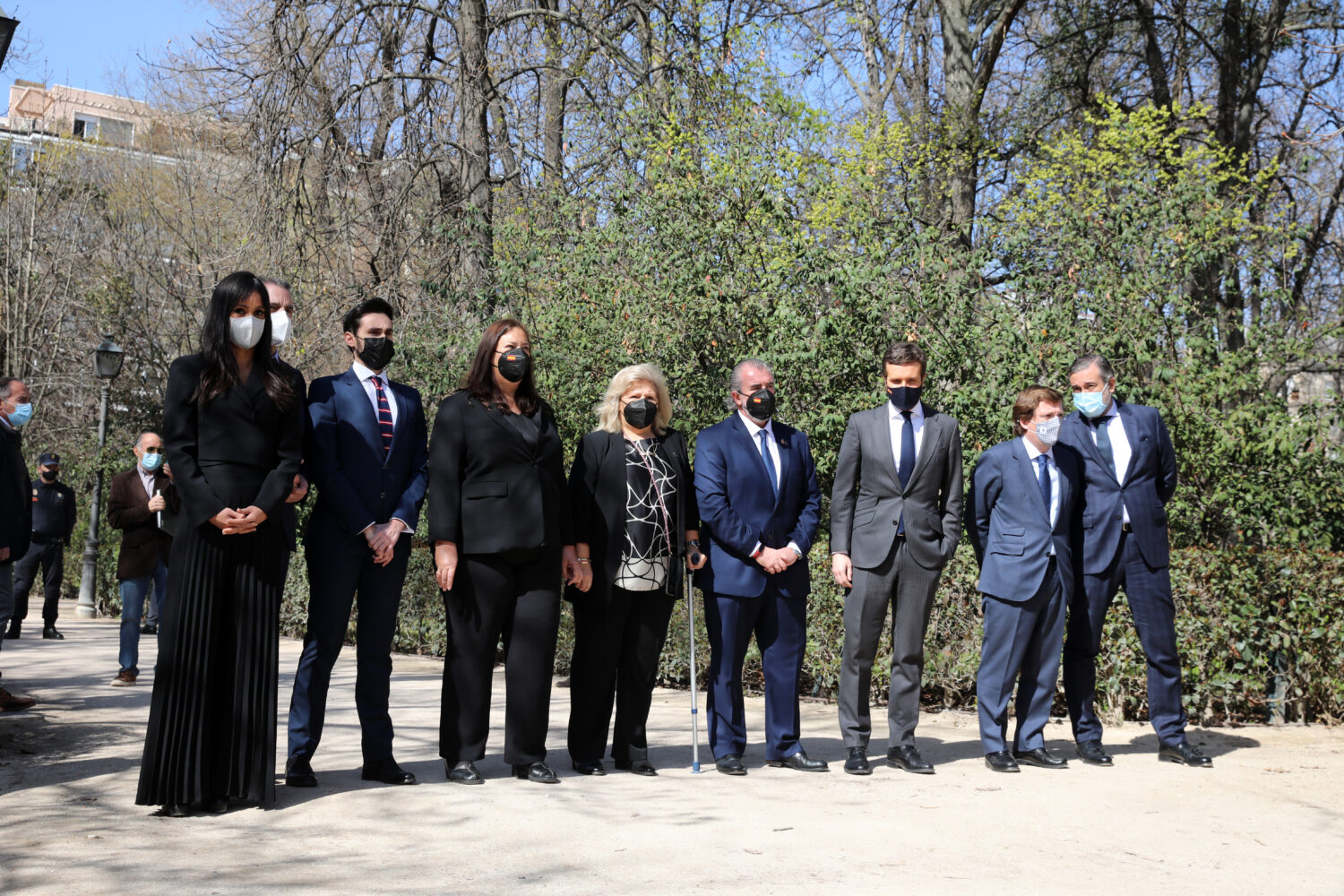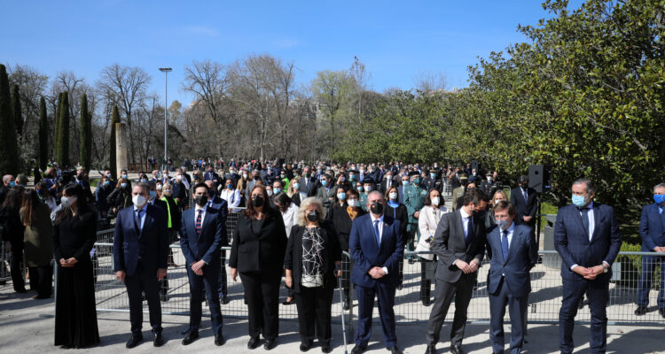 El alcalde de Madrid, José Luis Martínez-Almeida, junto a la vicealcaldesa, Begoña Villacís, han asistido hoy al acto conmemorativo del Día Europeo de las Víctimas del Terrorismo, instaurado por el Parlamento Europeo tras los atentados sufridos en Madrid el 11 de marzo de 2004, que se ha celebrado en el Bosque del Recuerdo del parque de El Retiro.
