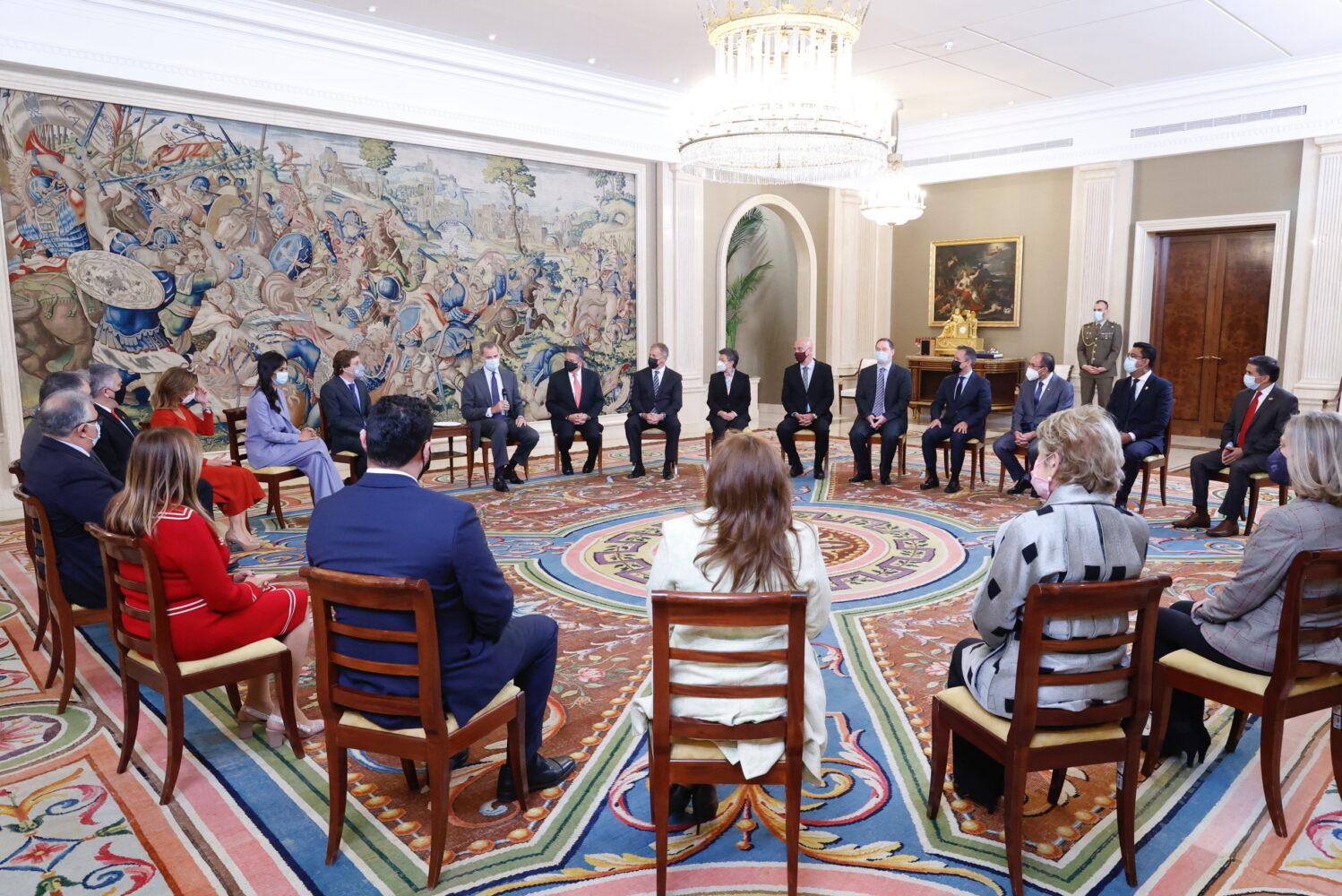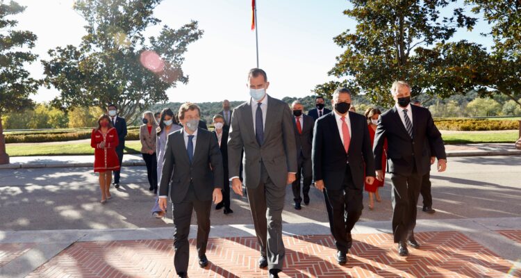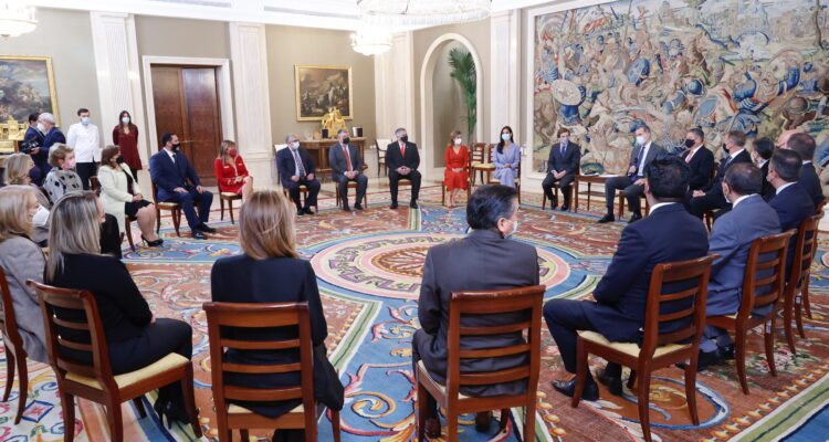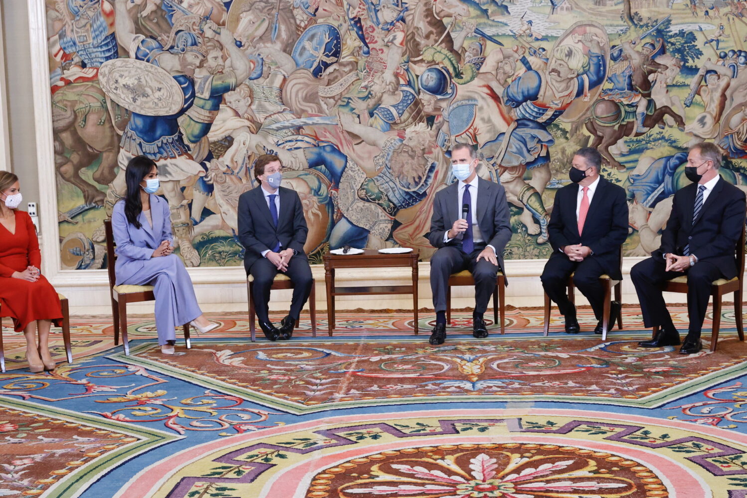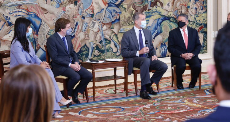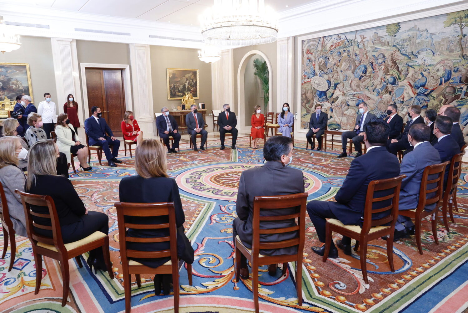 El alcalde de Madrid y copresidente de la Unión de Ciudades Capitales Iberoamericanas (UCCI), José Luis Martínez-Almeida; la vicealcaldesa, Begoña Villacís, y la secretaria general de la UCCI, Almudena Maíllo, han sido recibidos este viernes en audiencia por el rey Felipe VI en el Palacio de La Zarzuela junto con los miembros de la XIX Asamblea de la UCCI que se ha celebrado en Madrid.