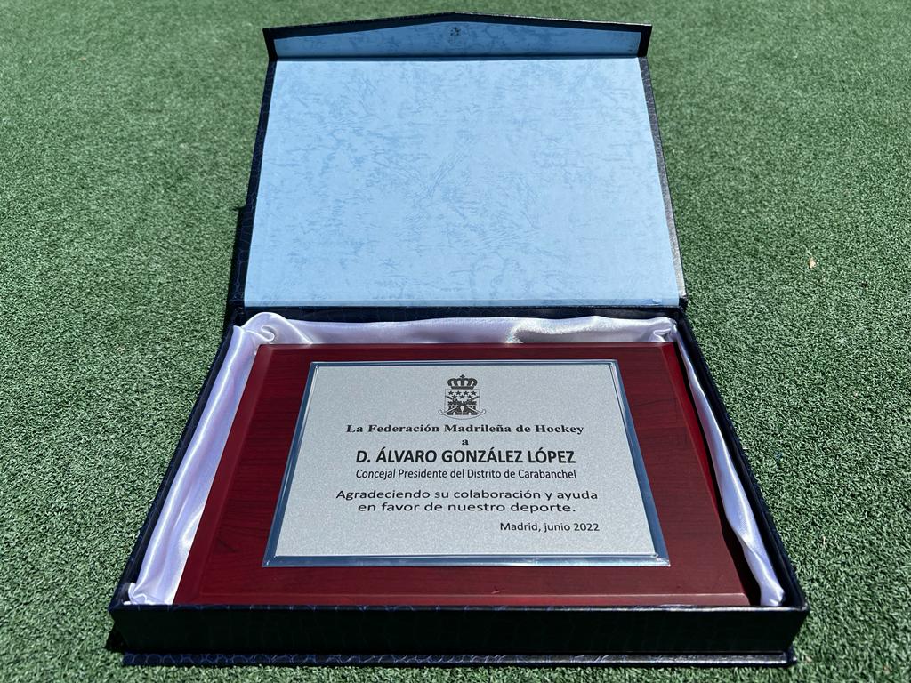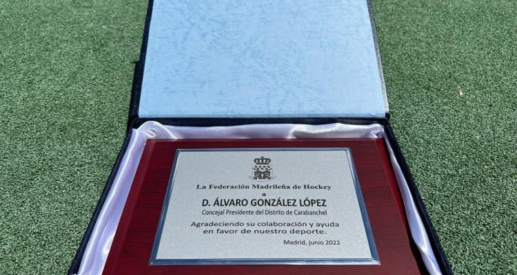 El concejal del distrito de Carabanchel, Álvaro González, ha recogido de manos de la presidenta de la Federación Madrileña de Hockey Hierba, María Ángeles Rodríguez, una placa honorífica en reconocimiento a la implicación y compromiso del distrito con este deporte, durante la gala de final de la temporada 2021-22 y ha reiterado que continuará su respaldo y atención al hockey que “como otros deportes que aún son minoritarios, requiere un especial apoyo”.