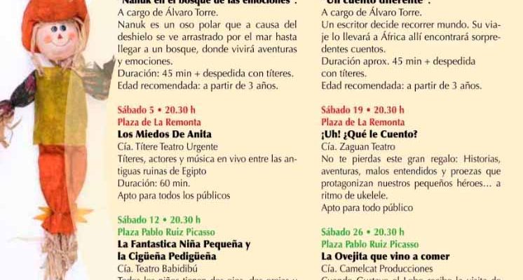 El día 19, de nuevo a las 20:30 h, en la plaza de la Remonta se representará ¡Uh! ¿Qué le Cuento?, a cargo de la compañía Zaguán Teatro, una función con historias, aventuras, malentendidos y proezas a ritmo de ukelele. Se cierra este mes de agosto dedicado a los títeres en la plaza Pablo Ruiz Picasso el sábado 26, a las 20:30 h, con La Ovejita que vino a comer, de la compañía Camelcat Producciones.