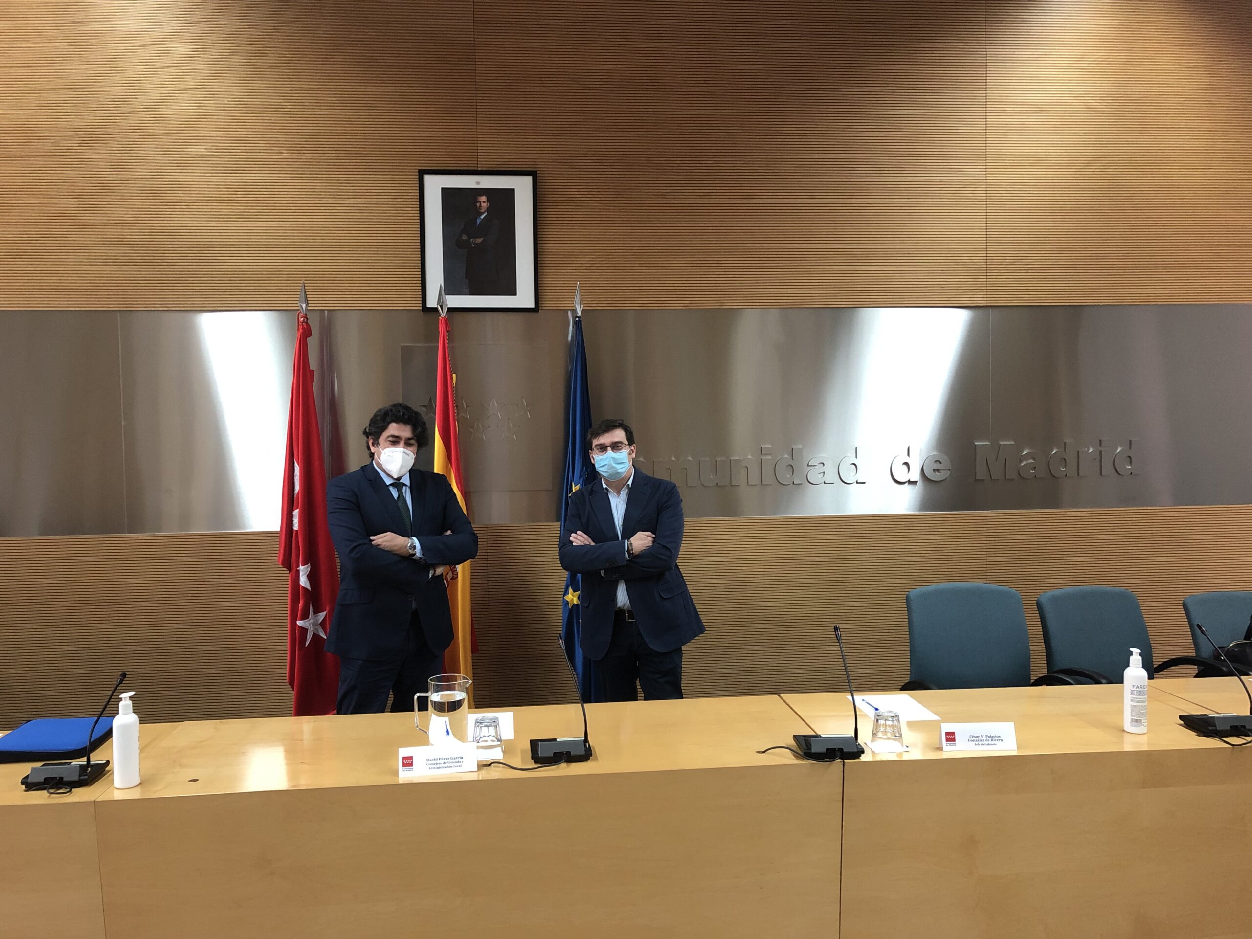 El concejal delegado de Vivienda, Álvaro González, y el consejero de Vivienda y Administración Local de la Comunidad de Madrid, David Pérez, han mantenido hoy un encuentro de trabajo para tratar la adopción de medidas de impulso y renovación del tejido residencial en la capital a través de un programa dotado con 41 millones de euros que permitirá rehabilitar cerca de 1.400 viviendas distribuidas en diez barrios.