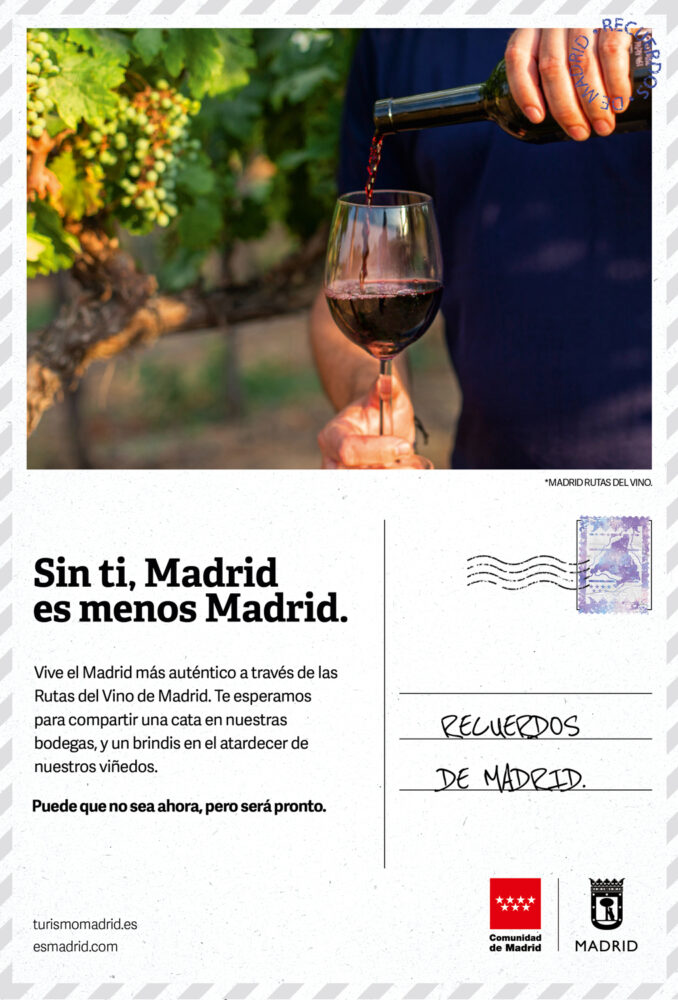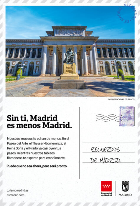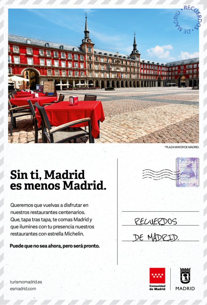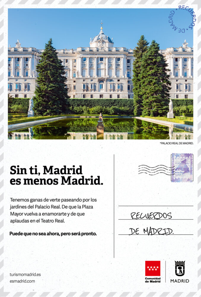 La campaña pone de manifiesto que todo aquello que hace grande al destino Madrid se reduce sin personas con quiénes compartirlo, sin sus visitantes. Una idea reflejada en su lema ‘Sin ti, Madrid es menos Madrid’. Con esta frase se pretende recordar que Madrid no es la misma sin quienes la visitan y para ellos, se lanza este otro mensaje final: ‘Puede que no sea ahora, pero será pronto’.