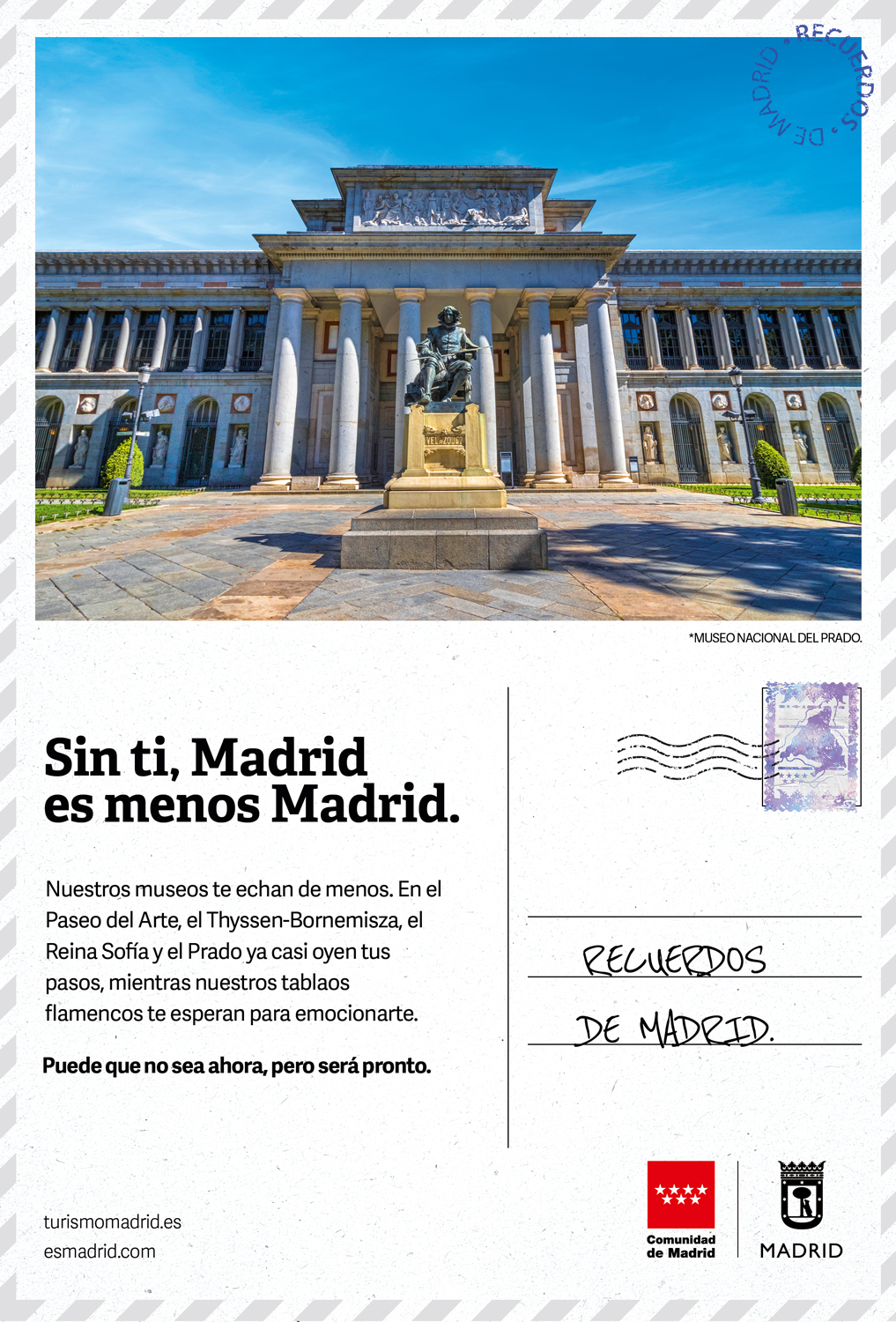 El Ayuntamiento, a través del Área Delegada de Turismo, y la Comunidad de Madrid, a través de la Consejería de Cultura y Turismo, han diseñado la campaña ‘Recuerdos de Madrid’, una acción de promoción turística conjunta para todos aquellos a quienes les gustaría visitar la capital y la región pero no pueden hacerlo debido a la crisis sanitaria de la COVID-19. El destino Madrid lanza así un emotivo mensaje a sus visitantes recordándoles que se les echa de menos a través de esta iniciativa en positivo que muestra la historia, el arte, la gastronomía, la naturaleza y las emociones que eso imprime en sus visitantes.
