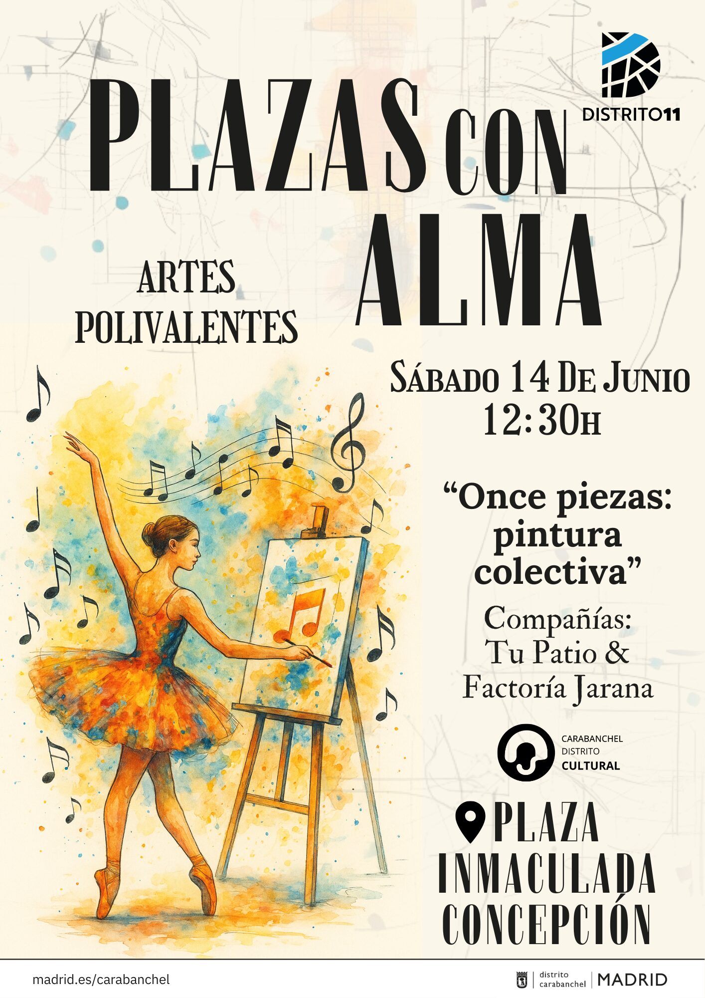 La primera muestra será ‘11 piezas’ producida por la Compañía Tu Patio & Factoría Jarana y podrá visitarse desde las 12:30 h. Con este primer proyecto, la Junta Municipal de Carabanchel busca fomentar la creatividad y la unión social a través de la pintura colectiva. En este sentido, los vecinos llevarán lienzos y materiales de arte a la plaza para que personas de todas las edades puedan expresarse libremente y construir juntos una obra única compuesta por 11 piezas. Además, la plaza se ambientará con poemas que podrán leerse y una banda sonora.