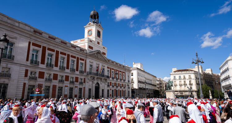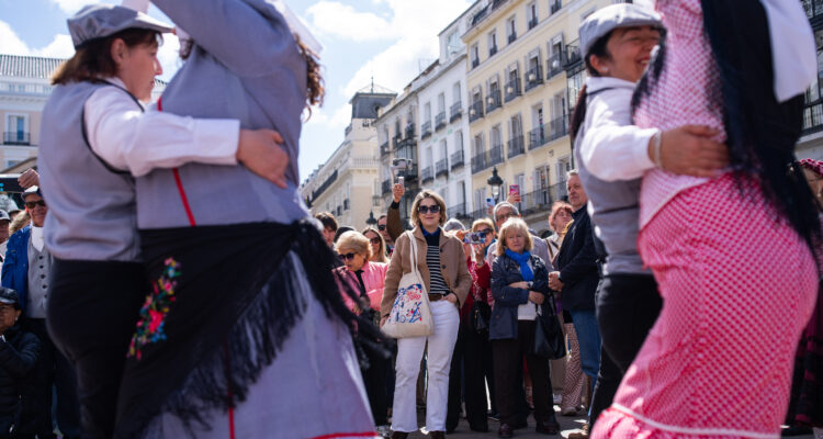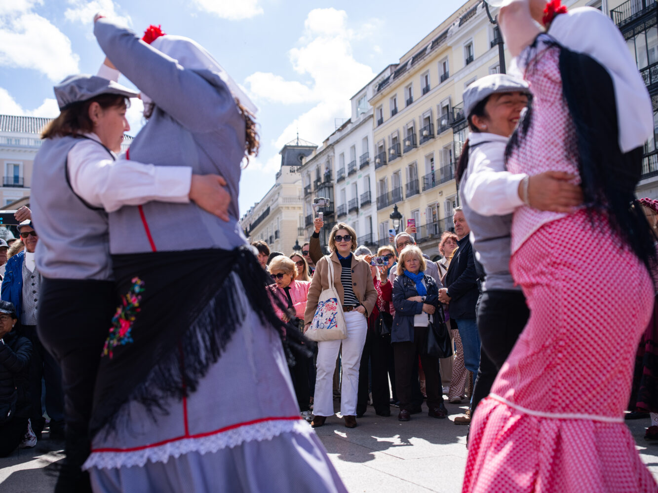 Organizado por la Academia de Bailes de Salón Date un Respiro con la colaboración de la Banda de Música de Moratalaz, el pasacalles ha partido de la Puerta del Sol hasta la plaza de Oriente, llenando las calles de tradición, color y ritmo, con más de 450 chulapos y chulapas. Participantes de todas las edades, ataviados con los trajes típicos, han bailado al son de chotis, pasodoble, java y swing en un ambiente festivo y participativo que ha animado a madrileños y visitantes a unirse a la celebración.