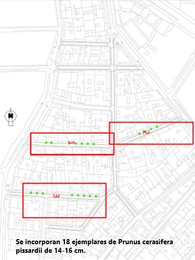 Además, se contempla una banda de vegetación separadora de la calzada en tres de las calles a intervenir: Tres Peces, Esperanza y Escuadra, que ya disponen de boca de riego y cuyas instalaciones existentes permiten su viabilidad.