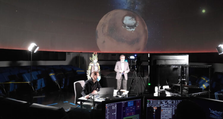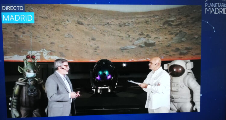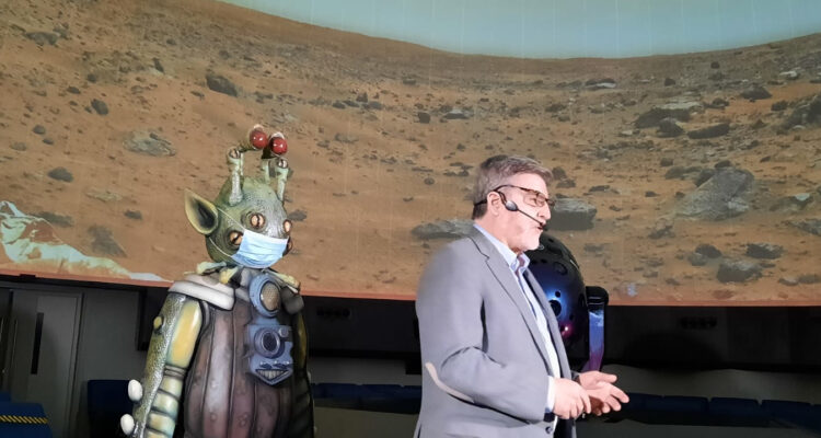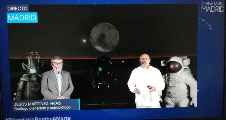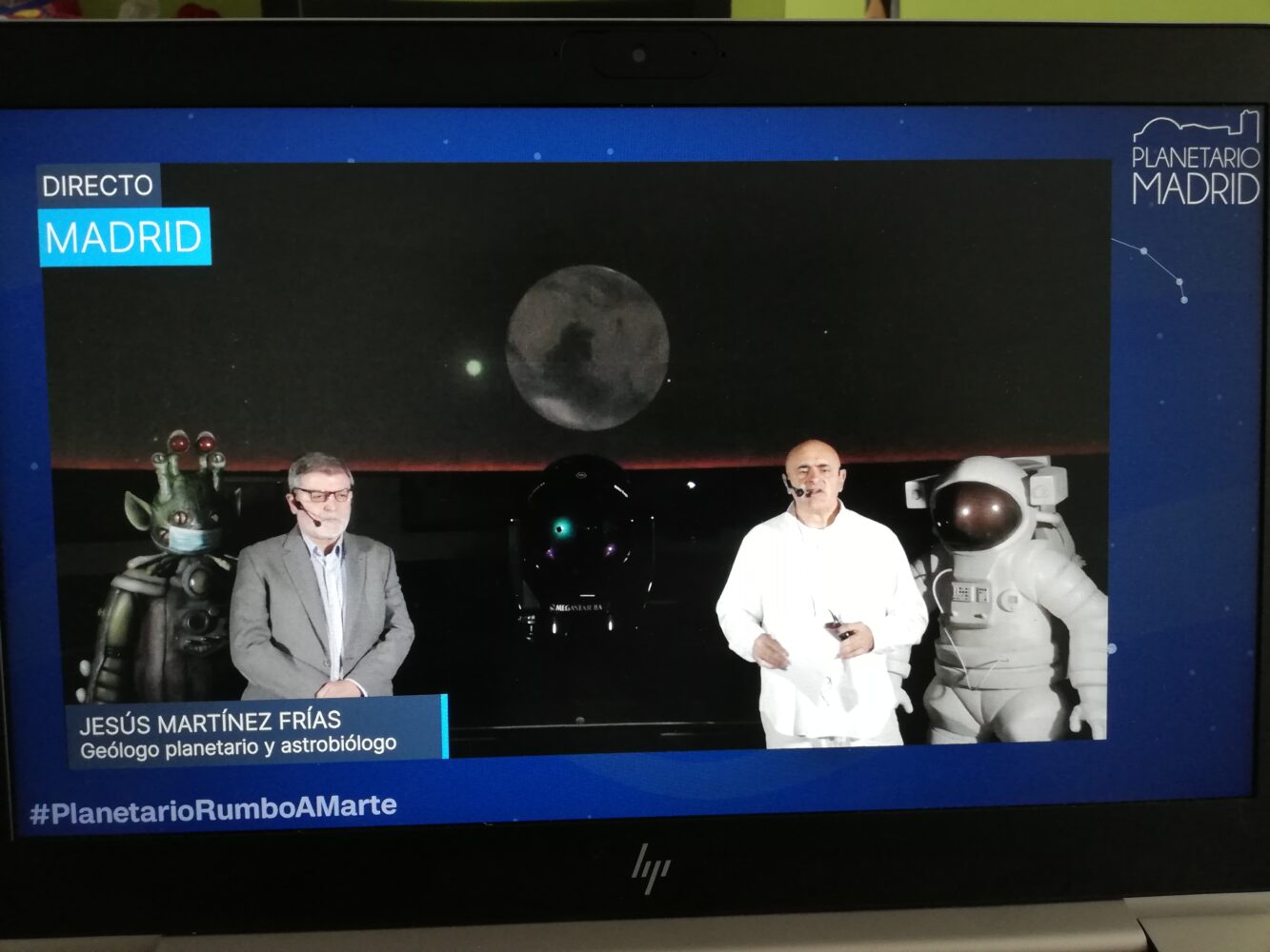 Rumbo a Marte es el título de esta conferencia que ha corrido a cargo de Jesús Martínez Frías, geólogo planetario y astrobiólogo del Instituto de Geociencias (centro mixto del CSIC y la Universidad Complutenses de Madrid) y miembro del equipo de ciencia del Perseverance. Él, junto al director de Planetario, Telmo Fernández Castro, ha acercado a estudiantes de 385 centros docentes del país las claves de las misiones en curso sobre el planeta rojo y ha respondido en directo y desde la Sala de Proyecciones de Plantario a las preguntas que les han formulado.