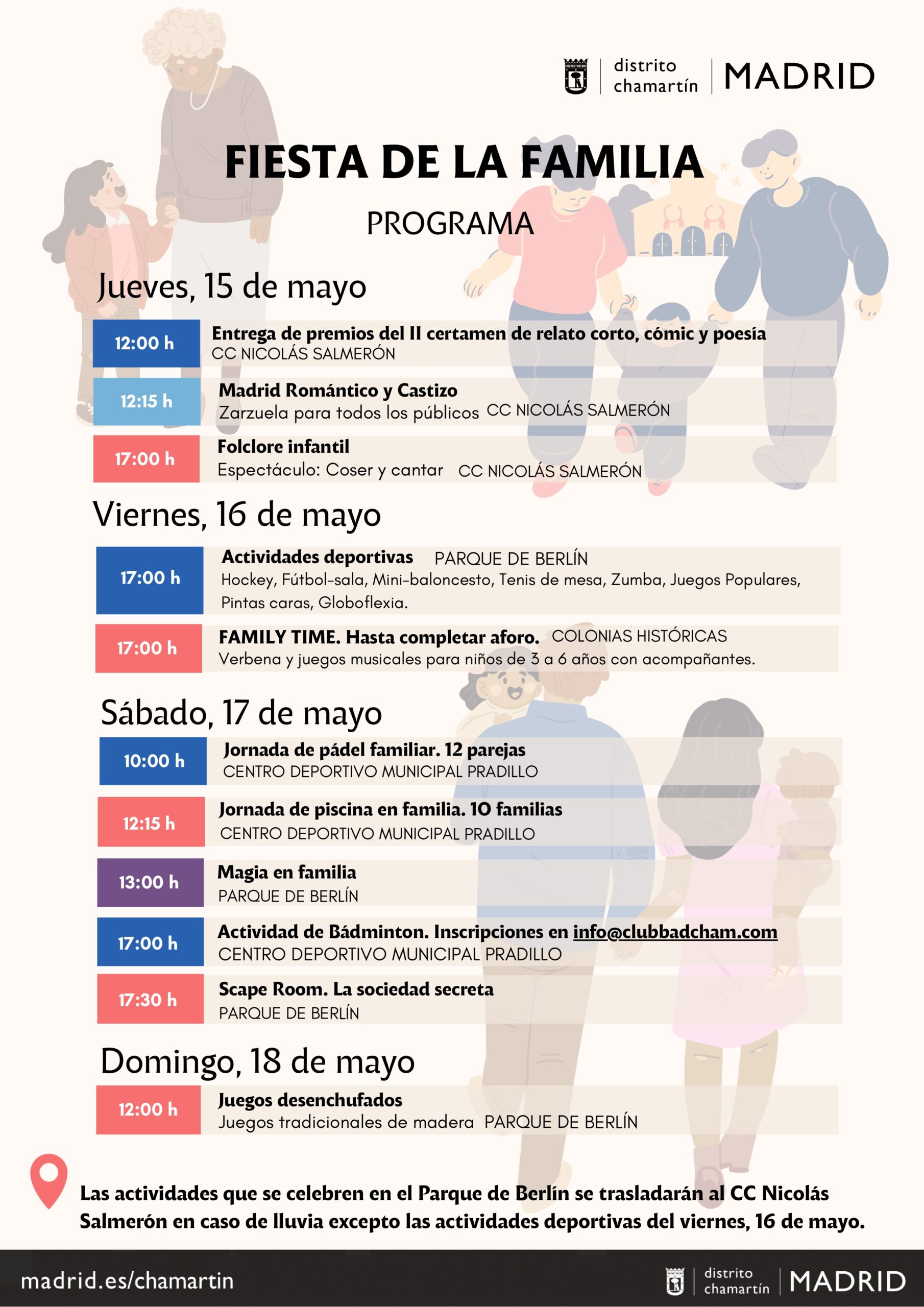 Desde mañana y hasta el domingo, Chamartín celebra la segunda edición de la Fiesta de la Familia con varias actividades para todas las edades en distintas ubicaciones del distrito. La programación arranca este jueves 15, a las 12:00 h, con la entrega de premios del II Certamen de Relato Corto, Cómic y Poesía por parte de la concejala, Yolanda Estrada, en el Centro Cultural Nicolás Salmerón. A continuación, a las 12:15 h, la compañía Taller de Zarzuela interpretará Madrid Romántico y Castizo. Por la tarde, a las 17:00 h tendrá lugar un espectáculo de folclore infantil titulado ‘Coser y cantar’, también en el centro cultural.