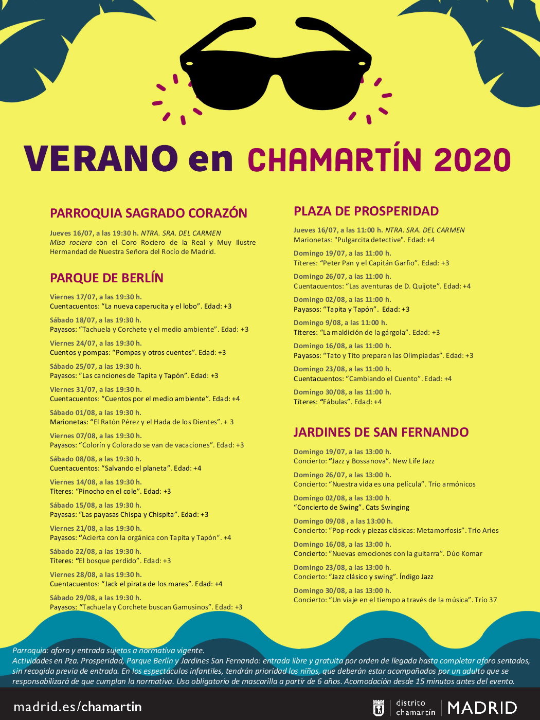 Los vecinos de Chamartín podrán disfrutar de más de una treintena de propuestas culturales y de ocio incluidas en el programa Verano en Chamartín 2020. La junta municipal del distrito ha diseñado un programa específico adaptado a las circunstancias actuales por la COVID-19 que abarca cine de verano, espectáculos infantiles y conciertos. El programa, que se difundirá en las cuentas oficiales de redes sociales con la etiqueta #VeranoenChamartín, se extenderá hasta principios de septiembre y el vecindario podrá disfrutarlo en emplazamientos como el parque de Berlín, la plaza de Prosperidad, los jardines de San Fernando y el patio del Centro Cultural Nicolás Salmerón.