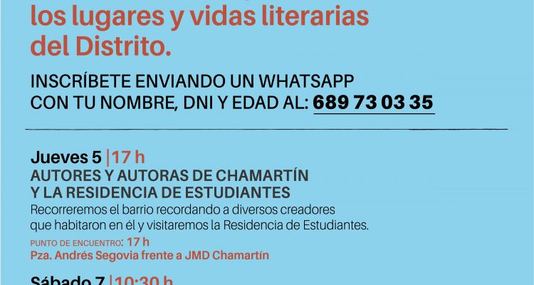 Además de las actividades propias de la feria, también se han organizado dos rutas literarias para conocer la vida de los autores que vivieron en el distrito, la Residencia de Estudiantes y el Museo de Ciencias Naturales. Serán los días 5 y 7 de mayo y es necesario inscribirse previamente enviando un wasap al número 689 73 03 35./