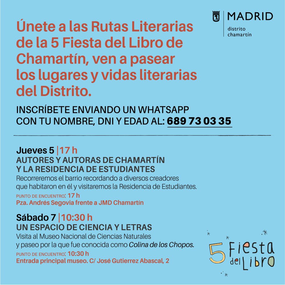 Además de las actividades propias de la feria, también se han organizado dos rutas literarias para conocer la vida de los autores que vivieron en el distrito, la Residencia de Estudiantes y el Museo de Ciencias Naturales. Serán los días 5 y 7 de mayo y es necesario inscribirse previamente enviando un wasap al número 689 73 03 35./