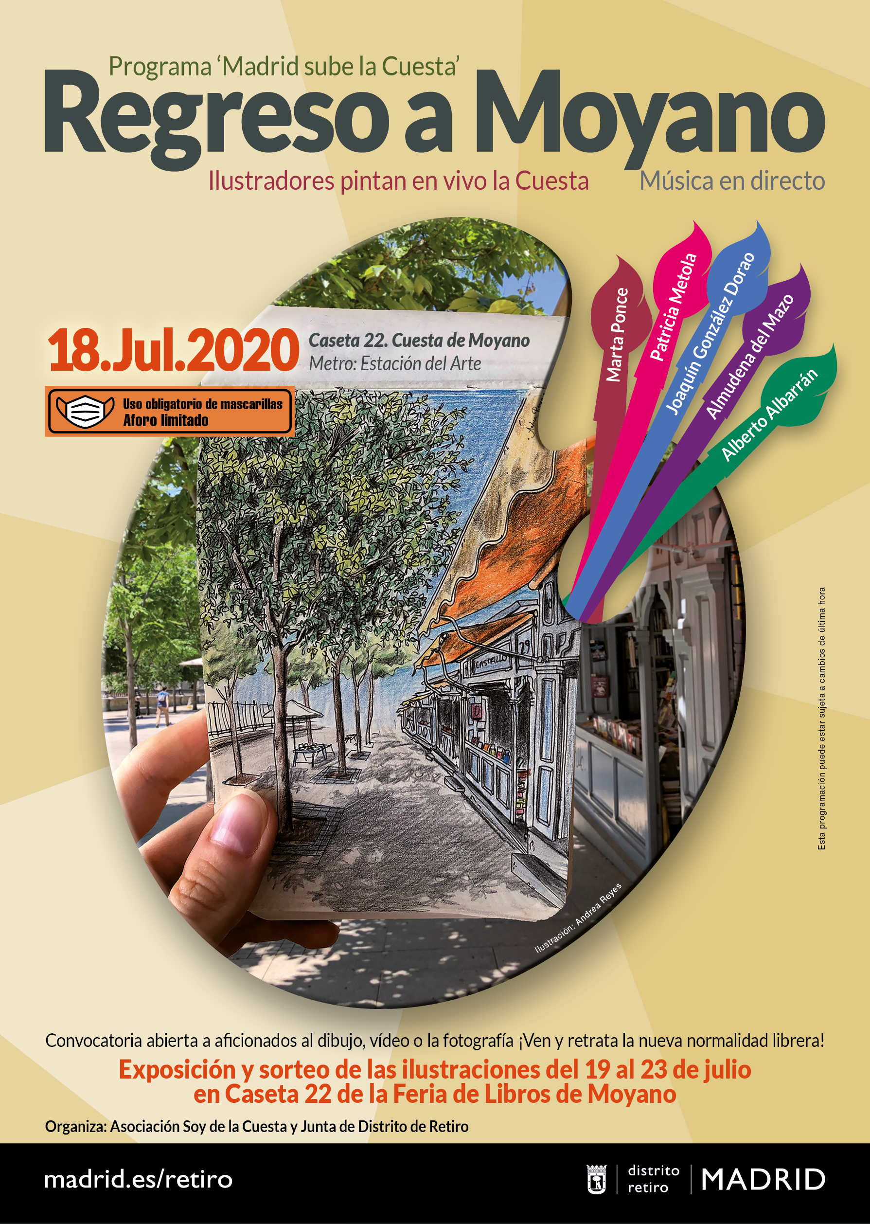 El próximo sábado, 18 de julio, a partir de las 12:00 h, los ilustradores Almudena del Mazo, Alberto Albarrán, Joaquín González Dorao, Patricia Metola y Marta Ponce pintarán en vivo el regreso de público y libreros a la Cuesta de Moyano acompañados de la música en directo del saxofonista Miguel Le Goff y del dúo de guitarra y violín Melopea. La convocatoria también está abierta para que aficionados al dibujo, la fotografía o el vídeo se sumen a reflejar la vuelta a Moyano.