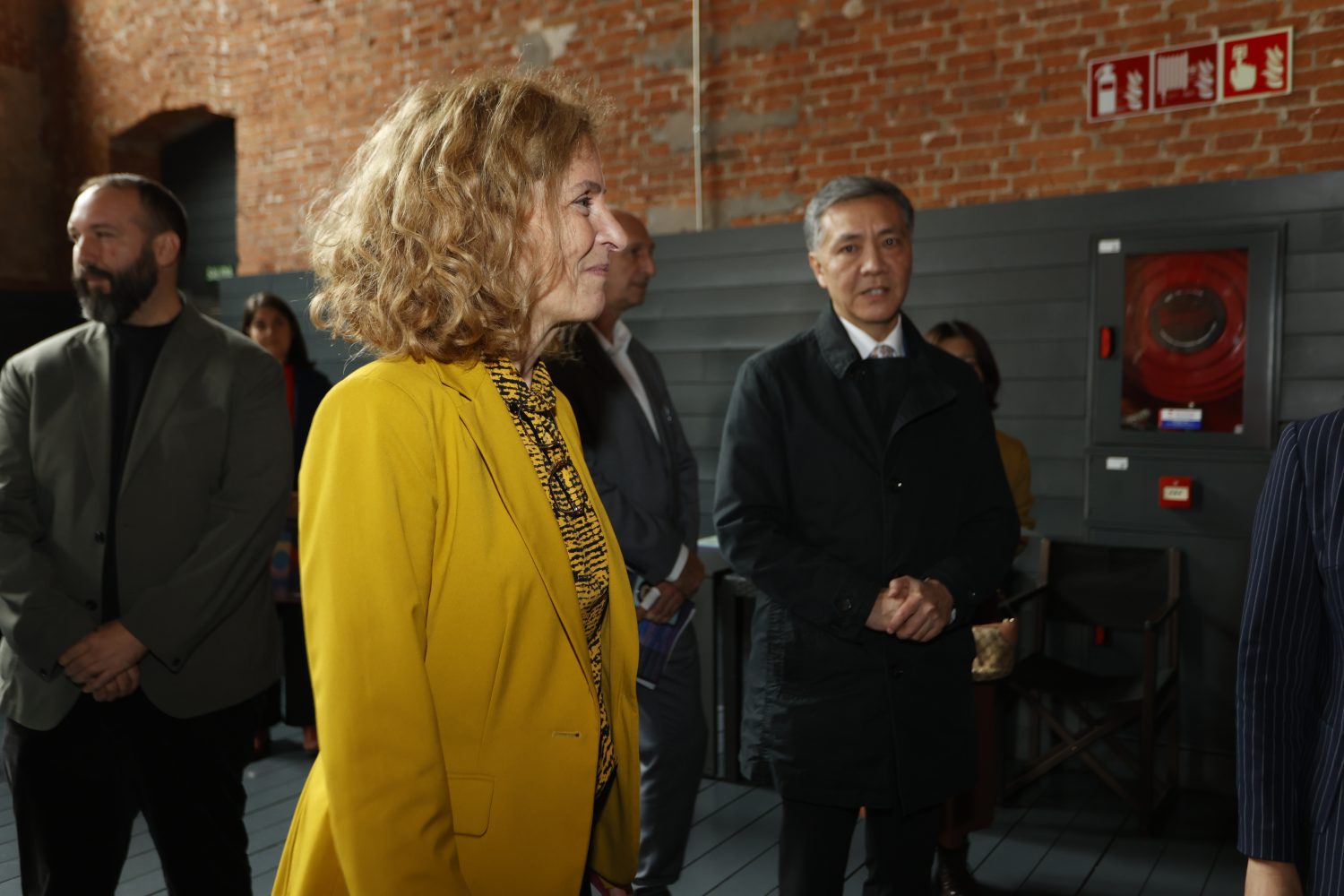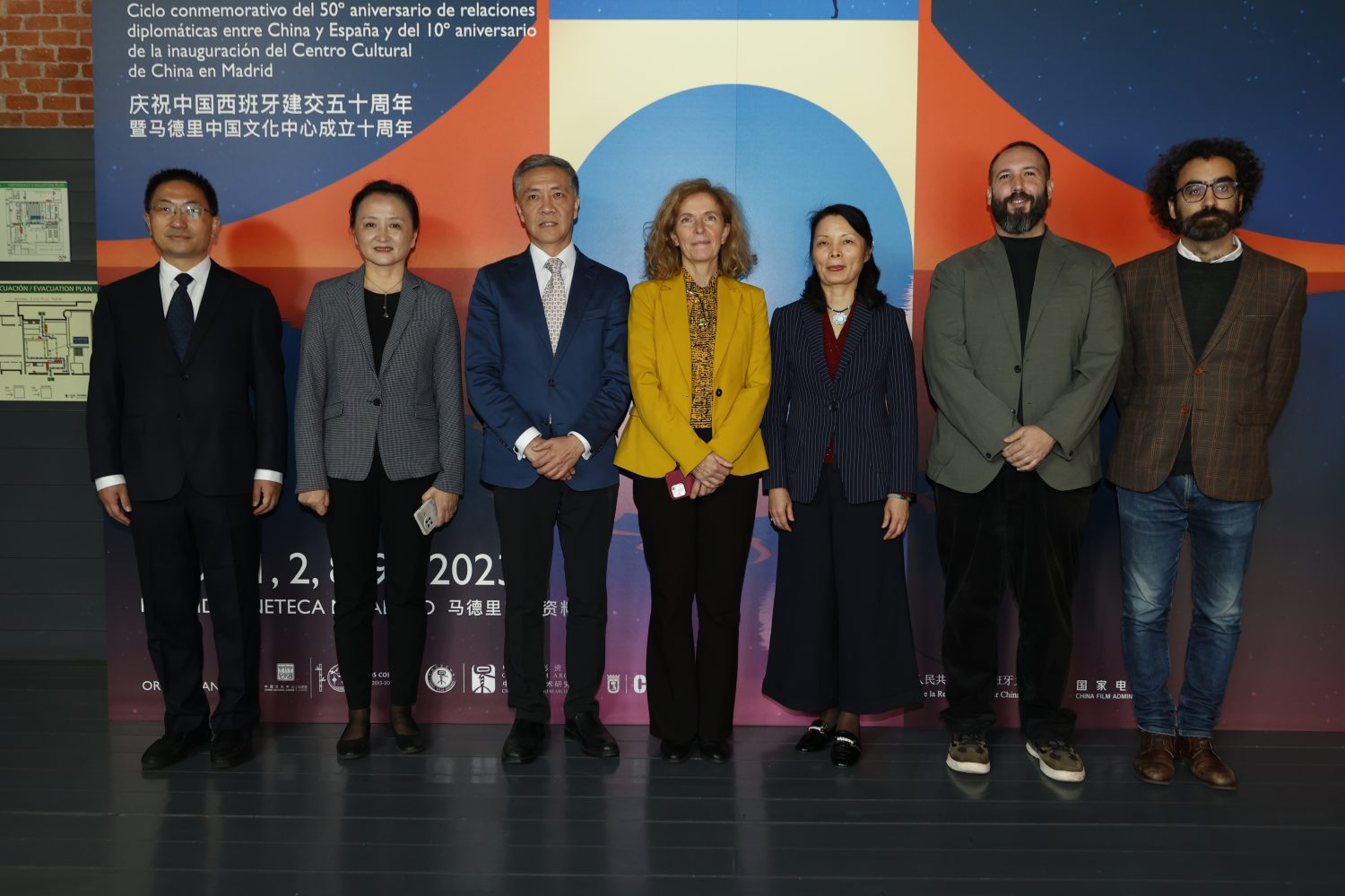 Presentación, este martes, de la muestra. De izquierda a derecha: Yan Peng, director del Departamento de la Industria Cinematográfica de la Administración de Cine de China; Yang Changqing, directora el Centro Cultural de China en Madrid; He Yong, ministro consejero de Cultura de la Embajada de la R.P. China en España; María José Barrero García, coordinadora general de Cultura del Ayuntamiento de Madrid; Zhang Xuxia, subdirectora de China Film Archive; José Luis Romo, director artístico de Matadero Madrid; y Luis E. Parés, director artístico de Cineteca Madrid