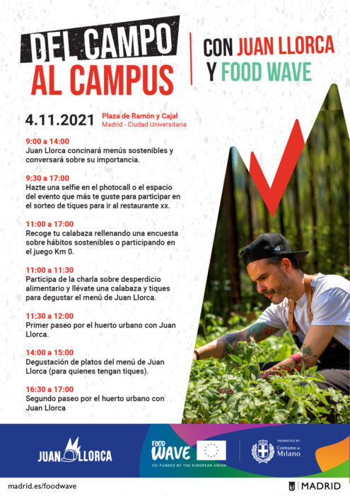 El cocinero valenciano, experto en nutrición y alimentación infantil, informará a los presentes y a través de sus redes sociales de la importancia de la cocina mediterránea, de temporada y proximidad, además de otros criterios fundamentales como la reducción del envasado y del desperdicio, objetivos del proyecto Food Wave. El escenario del huerto urbano de Ciudad Universitaria y de las actividades asociadas se podrán ver en toda su extensión gracias a la presencia de un dron.