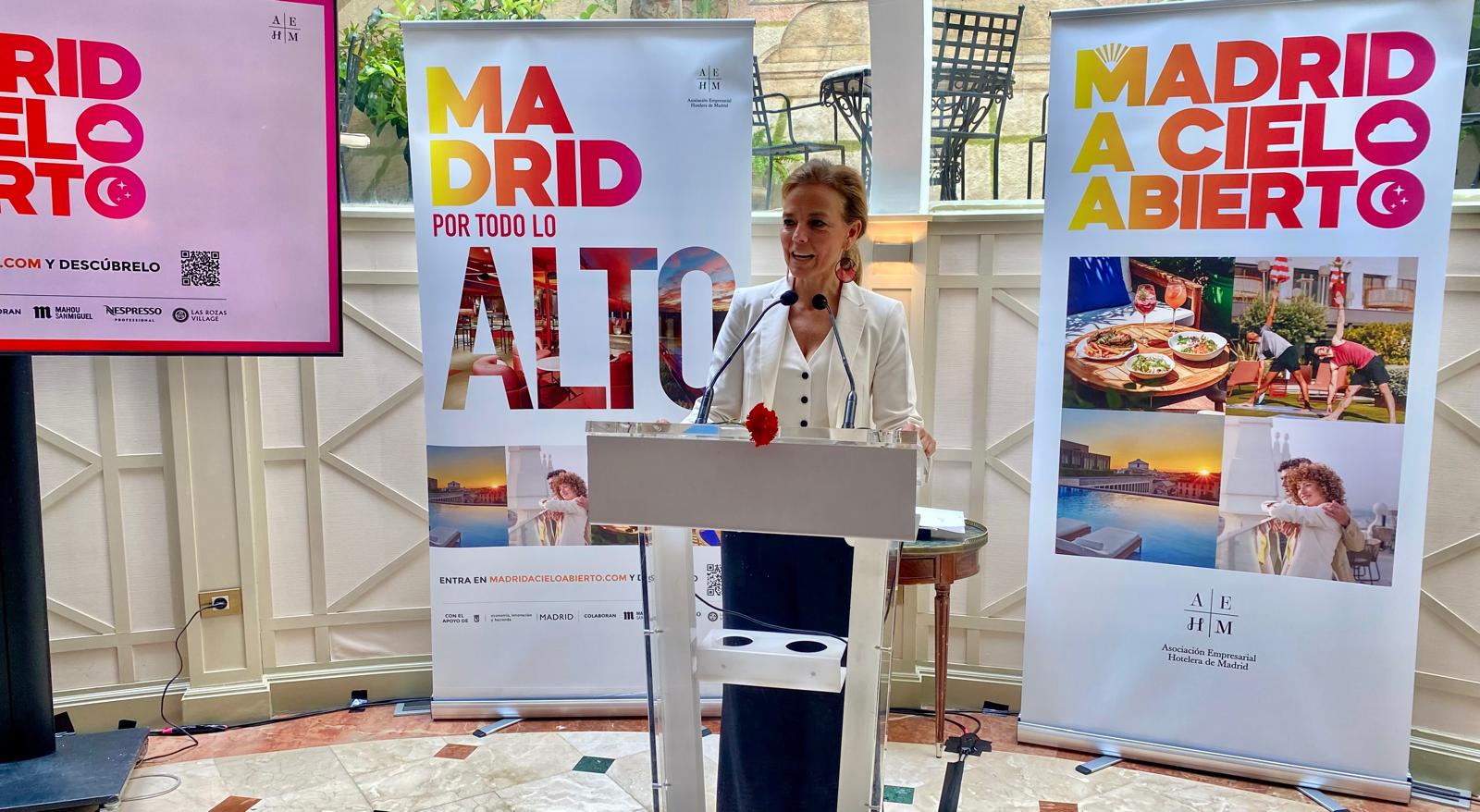 La concejala delegada de Turismo, Almudena Maíllo, ha intervenido hoy en el acto de presentación de la séptima edición de ‘Madrid a cielo abierto’, una iniciativa organizada por la Asociación Empresarial Hotelera de Madrid (AEHM) que se celebrará del 16 al 25 de mayo y que para Maíllo es “un ejemplo extraordinario de cómo los hoteles se abren a la ciudad y cómo Madrid se acerca a los hoteles”. La concejala ha subrayado la importancia del sector hotelero como motor económico, que genera más de 12.000 empleos directos y como dinamizador social, gastronómico, cultural y de ocio para madrileños y visitantes.