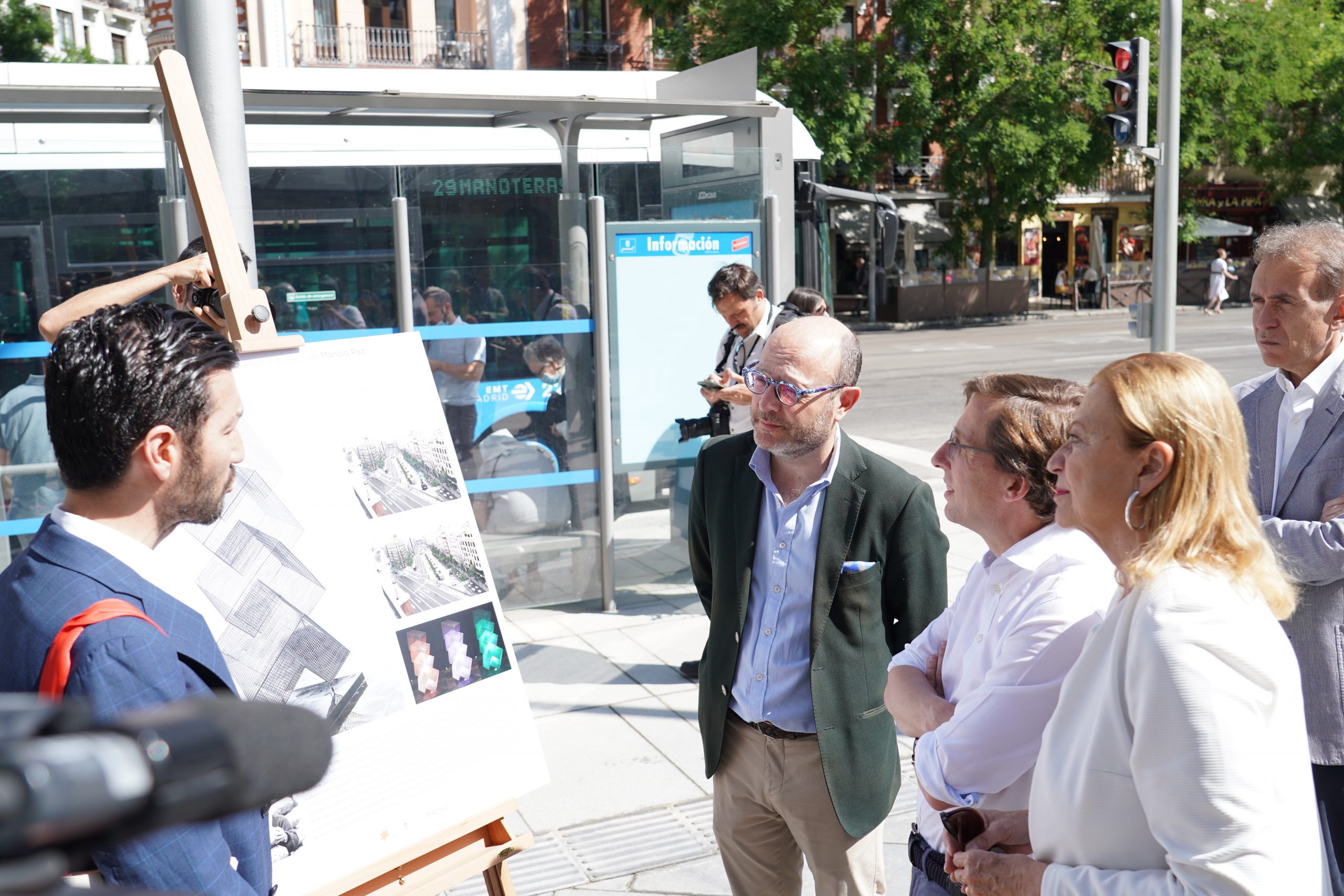 El alcalde, José Luis Martínez-Almeida, la delegada de Obras y Equipamientos, Paloma García Romero, y el concejal de Salamanca, José Fernández, conocen el proyecto de la escultura Transparencias