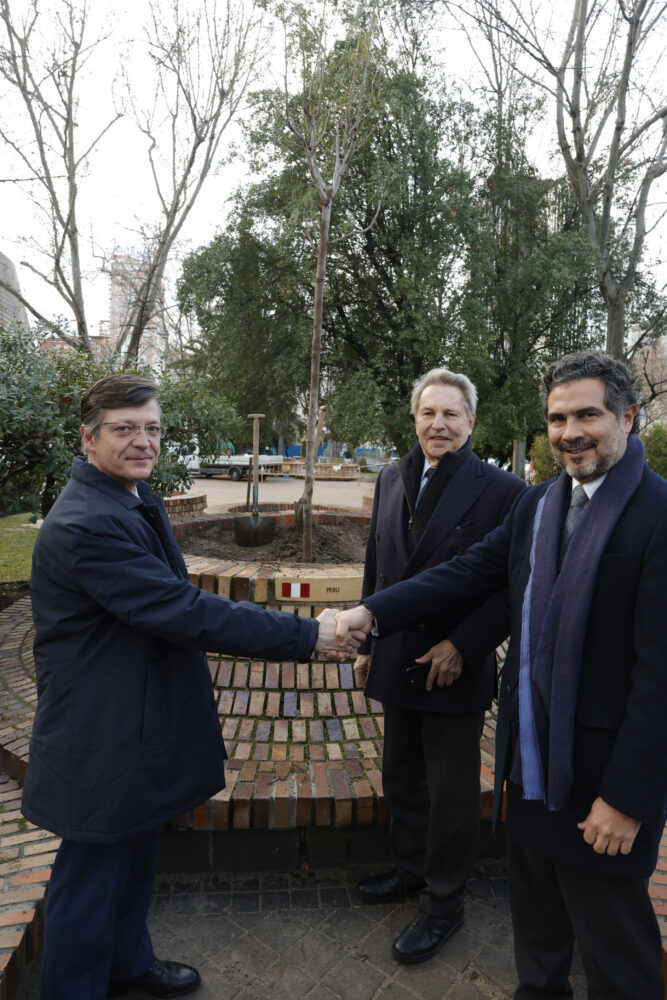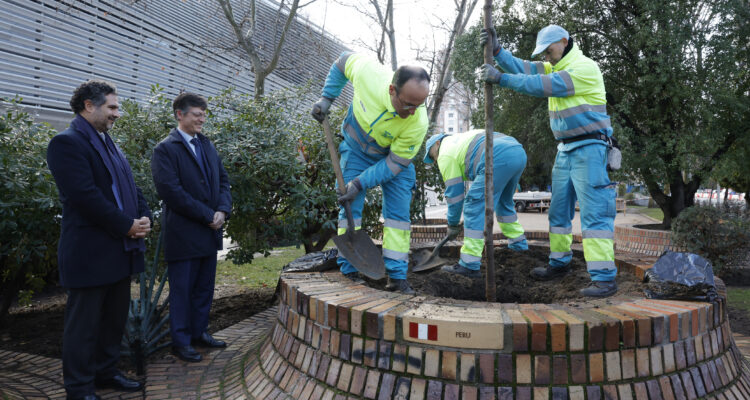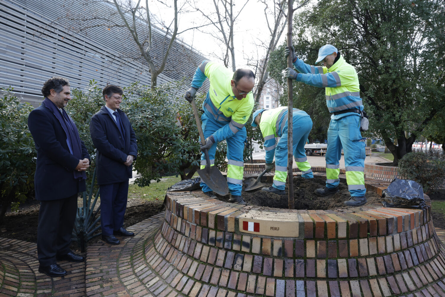 El concejal delegado de Limpieza y Zonas Verdes, José Antonio Martínez Páramo, ha participado hoy en la plantación de un ejemplar de árbol molle (Schinus molle) en los jardines del Mundial del distrito de Chamartín, promovida por la Embajada de Perú. De esta forma, el falso pimentero, árbol que representa al país andino, vuelve a estar presente en esta zona verde tras el derribo del anterior ejemplar como consecuencia de la tormenta Filomena.