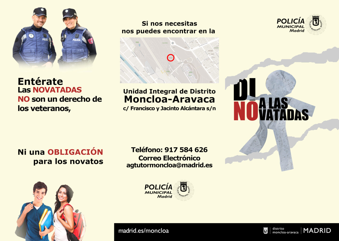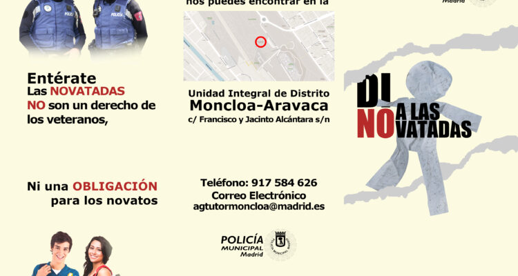 El distrito de Moncloa-Aravaca, junto a la Policía Municipal, Madrid Salud y la Universidad Complutense de Madrid, ha impulsado una campaña para prevenir las novatadas. Bajo el lema “Di no a las novatadas”, el plan que se ha puesto en marcha a principios de septiembre con el inicio del curso universitario, supone el refuerzo de la presencia policial a través de coches patrulla en las calles y parques de Ciudad Universitaria del distrito de Moncloa-Aravaca.