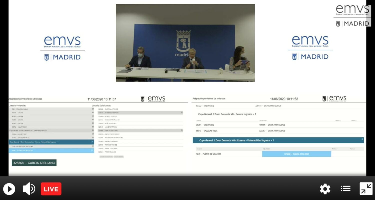 El Ayuntamiento de Madrid, a través de la Empresa Municipal de la Vivienda y Suelo (EMVS), ha celebrado este jueves el sorteo ante notario para adjudicar provisionalmente 163 pisos en alquiler. Se trata de la primera convocatoria de vivienda protegida de este mandato, en la que han participado casi 26.000 personas, los demandantes apuntados formalmente en el registro de solicitantes. El sorteo, presidido por el consejero delegado de la EMVS, Diego Lozano, se ha realizado a puerta cerrada debido a la crisis sanitaria provocada por el coronavirus. No obstante, todos los interesados lo han podido seguir a través de la web de la empresa pública, que lo ha emitido en directo.