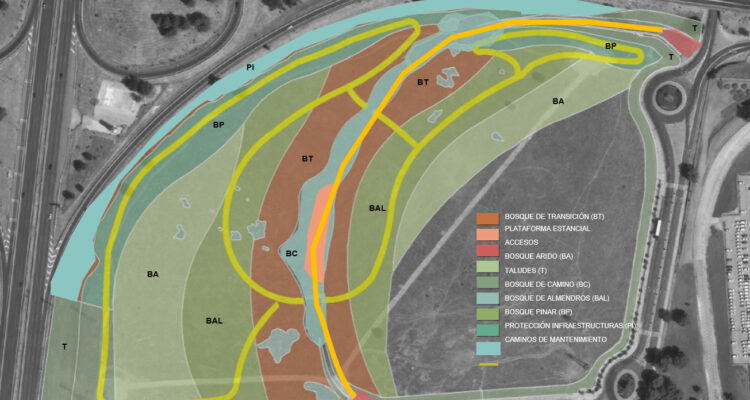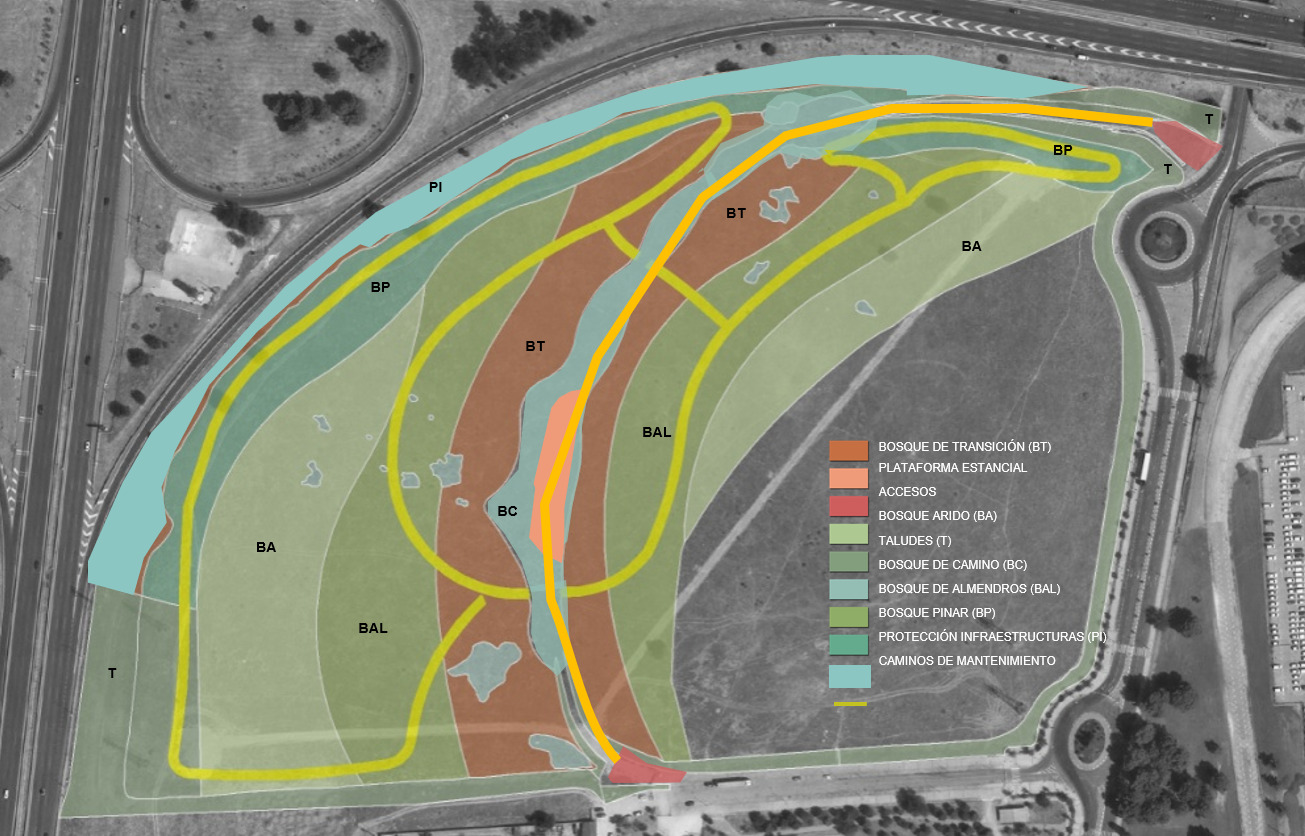 El camino de unión proporciona movimiento al proyecto y a la vez se adapta a las curvas de nivel para cumplir la accesibilidad. Con un tratamiento paisajístico que combina distintos estratos y floraciones, es el elemento que organiza la continuidad del recorrido e invita al paseante a descubrir el ámbito. Estará bordeado por árboles de mayor porte que le aportarán sombra y, a su vez, delimitará diferentes hábitats, concebidos como áreas forestales distintas, cada una con su propio arbolado.