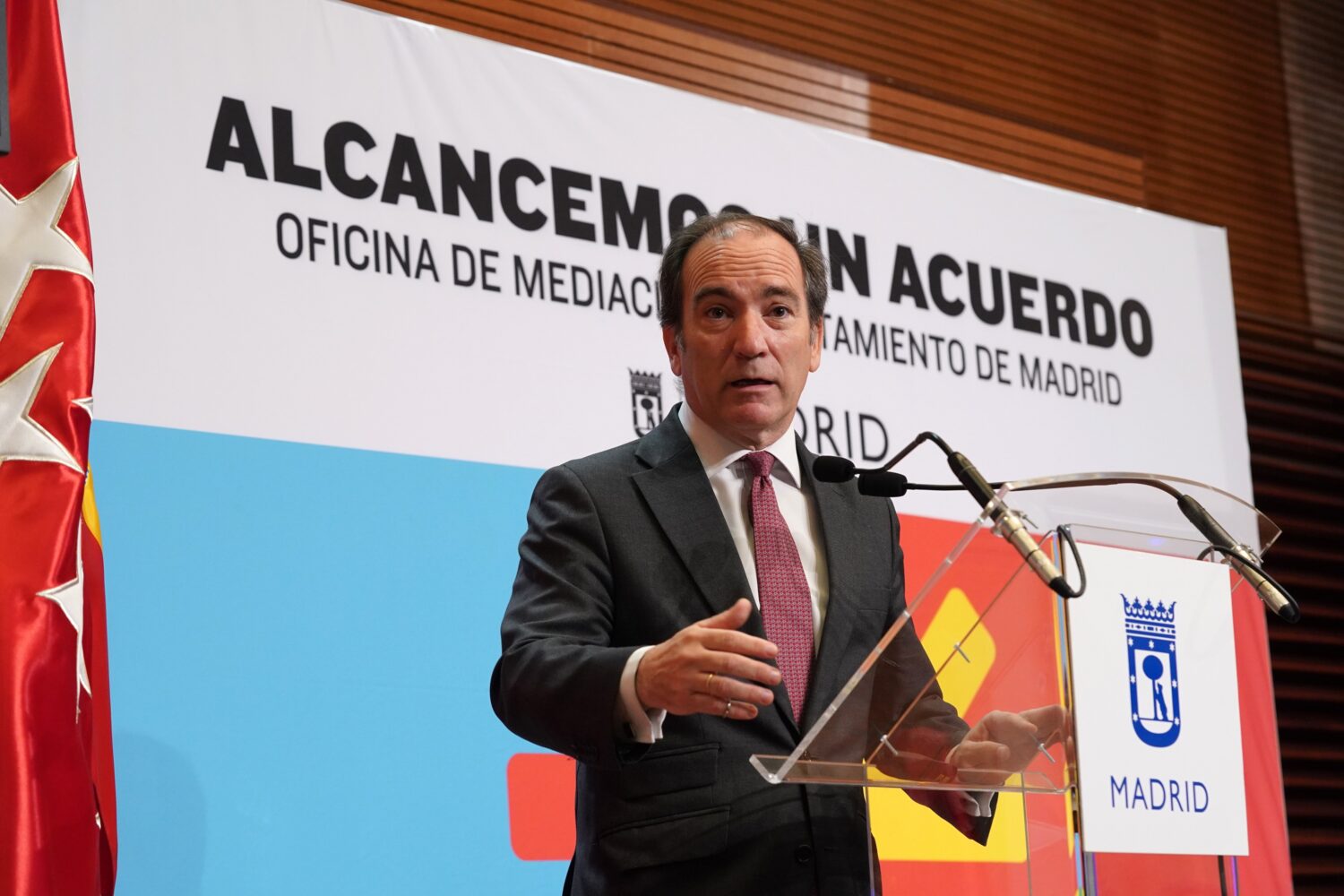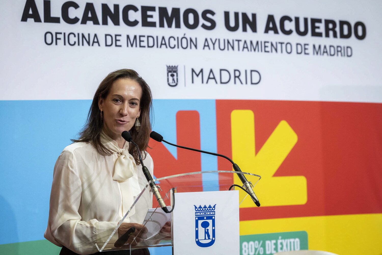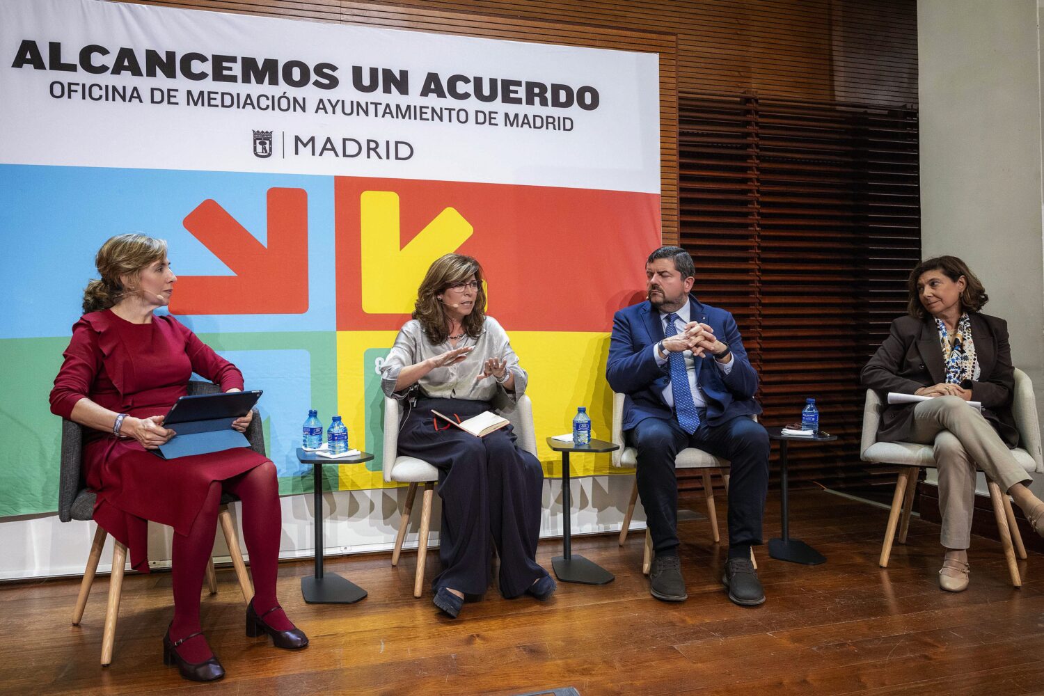 Diferentes imágenes del inicio, desarrollo y clausura de la jornada de la Oficina de Mediación del Ayuntamiento de Madrid, en la que han participado el delegado de Urbanismo, Medio Ambiente y Movilidad, Borja Carabante, y la coordinadora general de la Alcaldía, Inmaculada Sánchez-Cervera