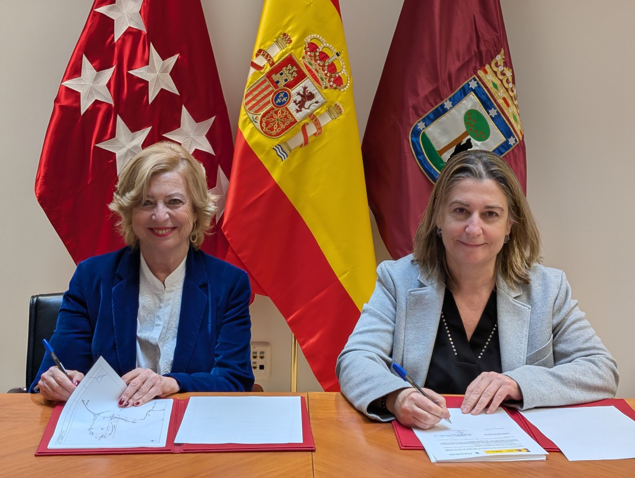 La delegada de Obras y Equipamientos, Paloma García Romero, y la ingeniera jefa de la Demarcación de Carreteras del Estado en Madrid, Gloria Ramos, han firmado esta mañana el acta de cesión al Ayuntamiento de Madrid por parte del Ministerio de Transportes y Movilidad Sostenible del tramo de la vía colectora de la A-2 comprendida entre los puntos kilométricos 0+000 y 3+773, sus conexiones con la avenida de la Hispanidad y la avenida Central y el tramo de la avenida de la Hispanidad desde su intersección con la calle de Riaño hasta sobrepasada la traza de la galería de conexión con el aliviadero del futuro colector proyectado.