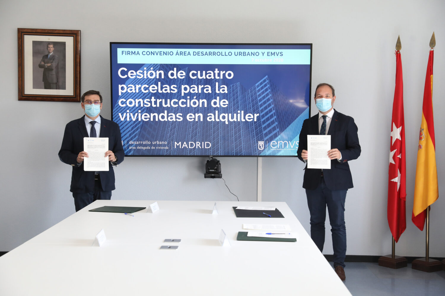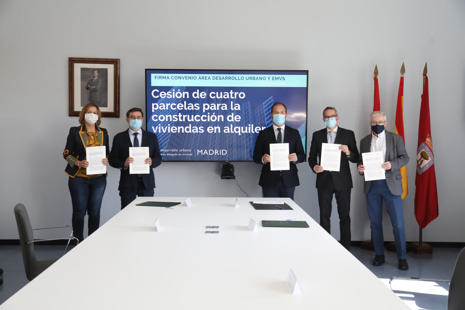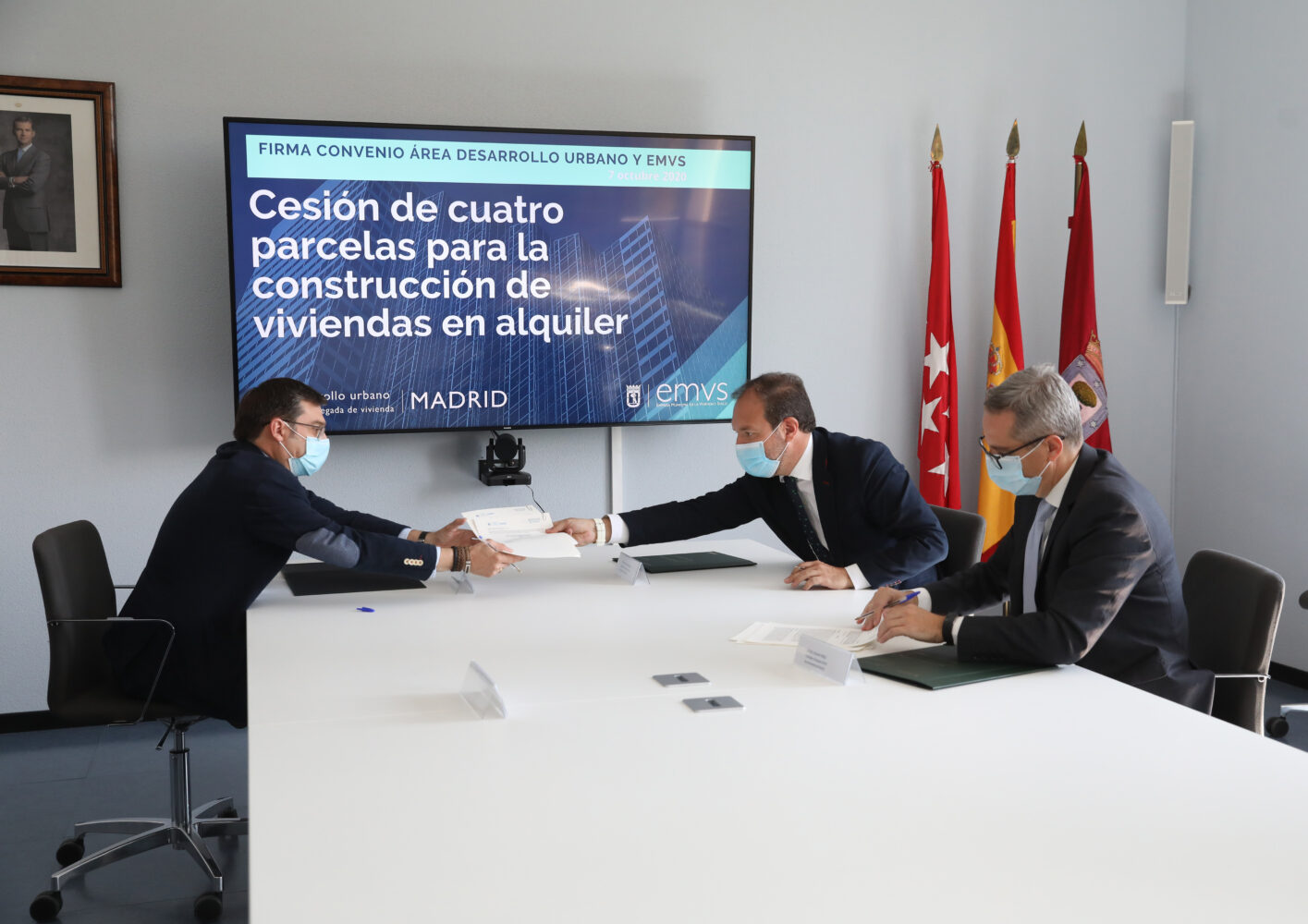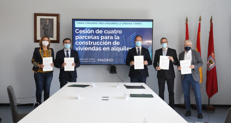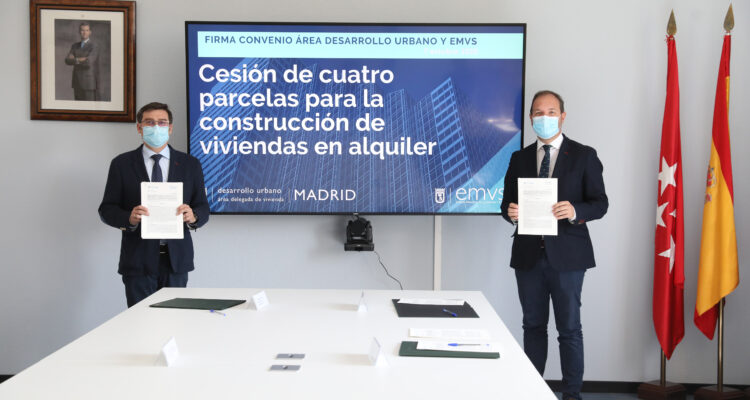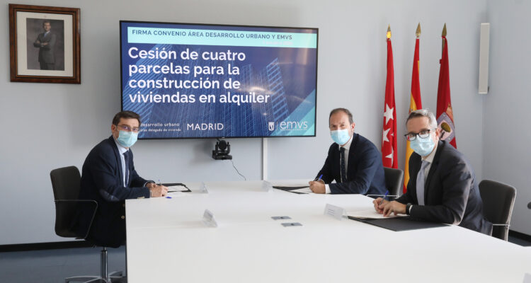 El Área de Gobierno de Desarrollo Urbano ha cedido de manera gratuita cuatro parcelas a la Empresa Municipal de la Vivienda y Suelo (EMVS) para que se puedan construir en estos terrenos viviendas protegidas en alquiler. La cesión se ha oficializado este miércoles con la firma de un convenio entre Mariano Fuentes, titular del Área de Desarrollo Urbano; Álvaro González, concejal delegado de Vivienda y presidente de la EMVS; y Diego Lozano, consejero delegado de la EMVS. La empresa pública se compromete a levantar las viviendas en un plazo de cinco años.