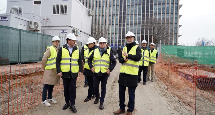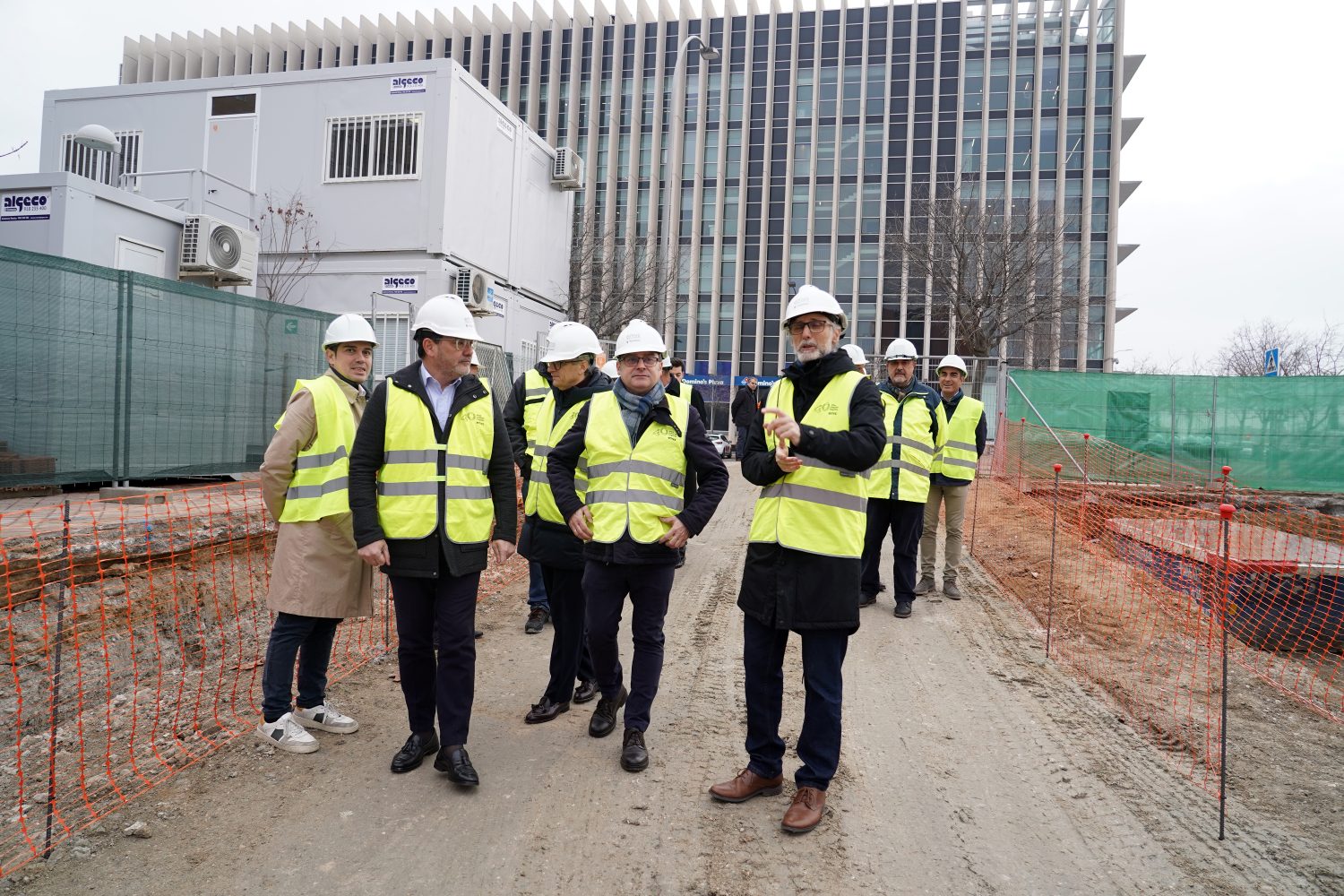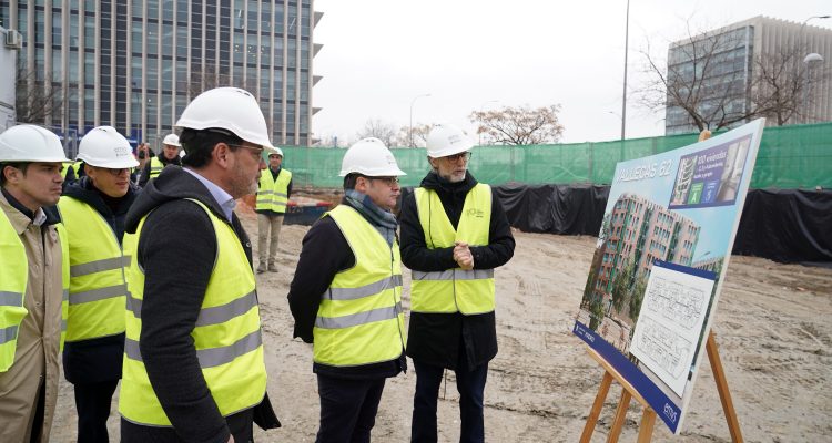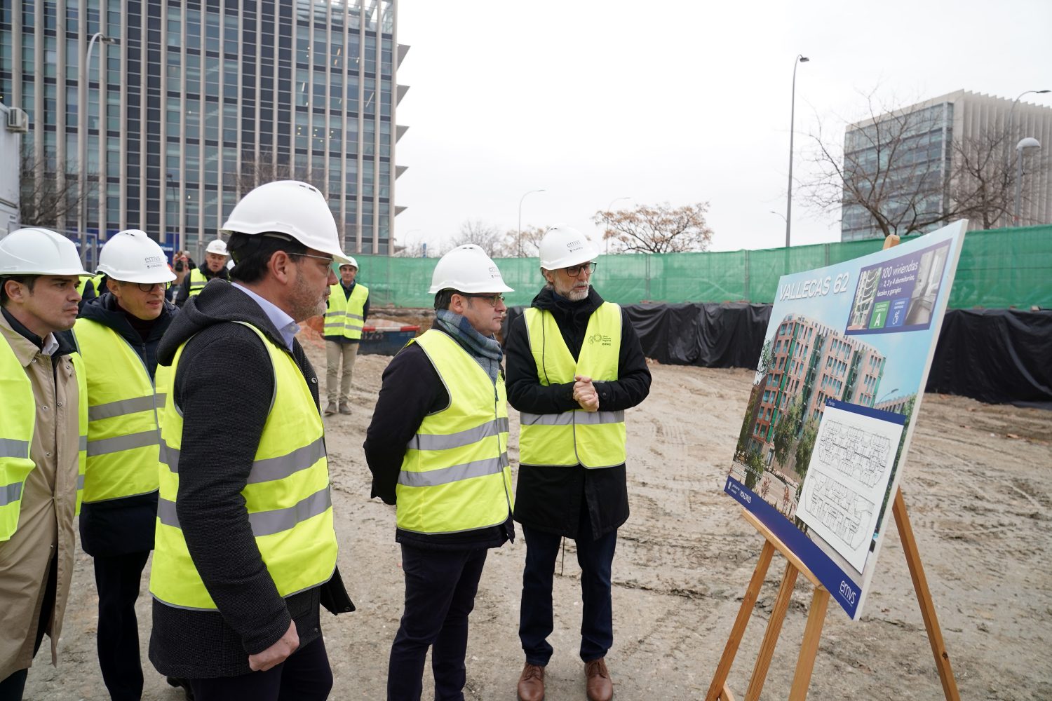 El delegado de Políticas de Vivienda y presidente de la Empresa Municipal de la Vivienda y Suelo (EMVS Madrid), Álvaro González, acompañado por el concejal de la Junta Municipal de Villa de Vallecas, Carlos González Pereira, y el consejero delegado de EMVS Madrid, Diego Lozano, ha visitado el inicio de las obras de construcción de 100 nuevos pisos en el Ensanche de Vallecas en régimen de alquiler asequible. Con una inversión municipal de 13,6 millones de euros la promoción Vallecas 62 cuenta también con 102 plazas de garaje y dos locales comerciales.