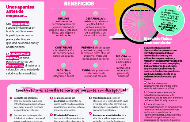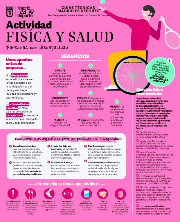 El Área Delegada de Deporte del Ayuntamiento de Madrid ha presentado la última de sus guías para la práctica segura de ejercicio físico para la salud que comprende indicaciones y ejercicios de entrenamiento para personas con obesidad e hipertensión arterial, riesgos cardiovasculares, riesgos musculoesqueléticos, estrés, ansiedad y depresión, fragilidad en personas mayores, embarazo y postparto, y personas con discapacidad.