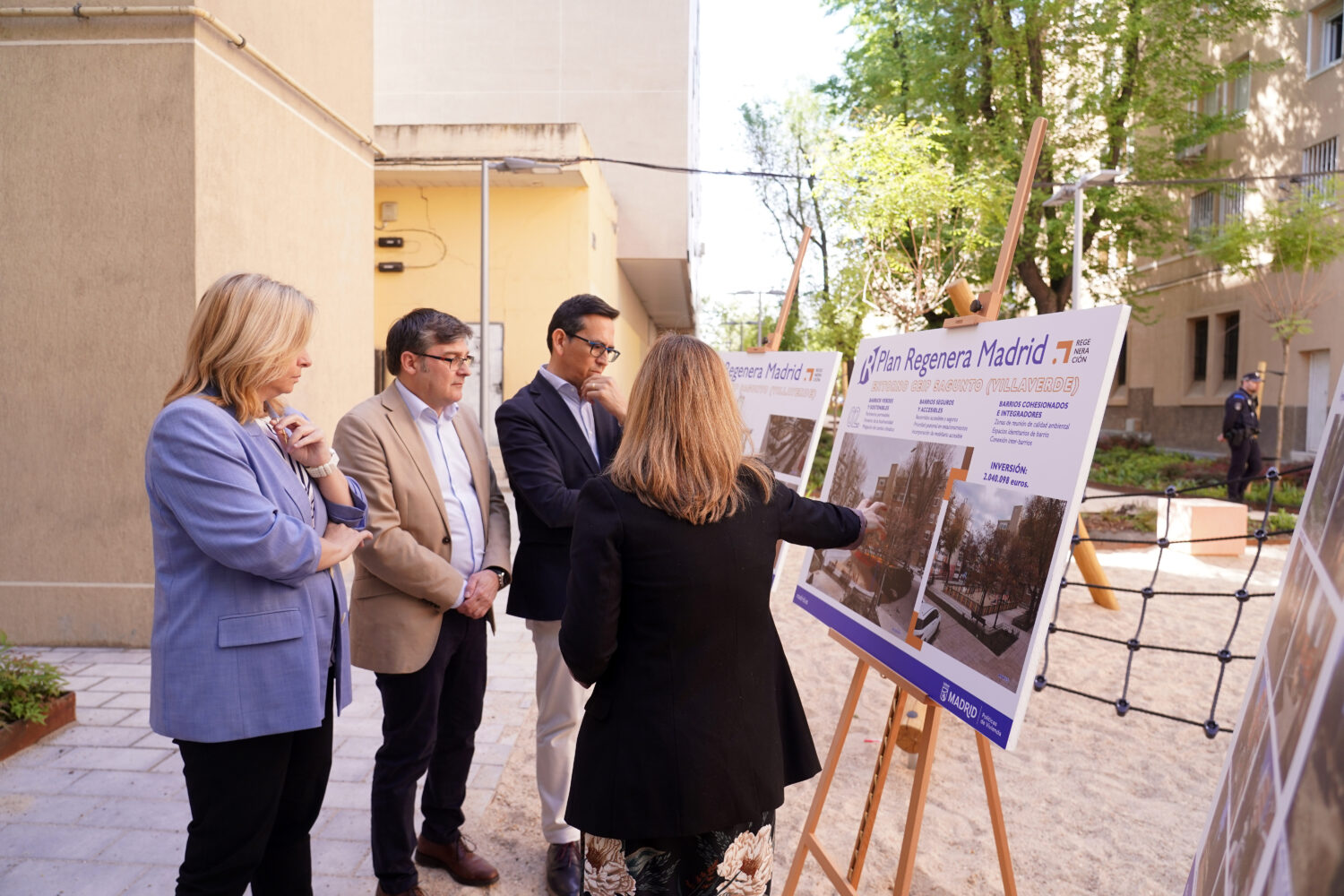 La vicealcaldesa de Madrid, Inma Sanz, acompañada del delegado de Políticas de Vivienda y presidente de la Empresa Municipal de Vivienda y Suelo (EMVS Madrid), Álvaro González, y el concejal de Villaverde, Orlando Chacón, ha presentado hoy el primer año de desarrollo del Plan Regenera Madrid y ha inaugurado las obras de regeneración del entorno del CEIP Sagunto, en el barrio de San Cristóbal de los Ángeles. Al acto también han asistido varios concejales cuyos distritos ya se están beneficiando de este proyecto municipal.
