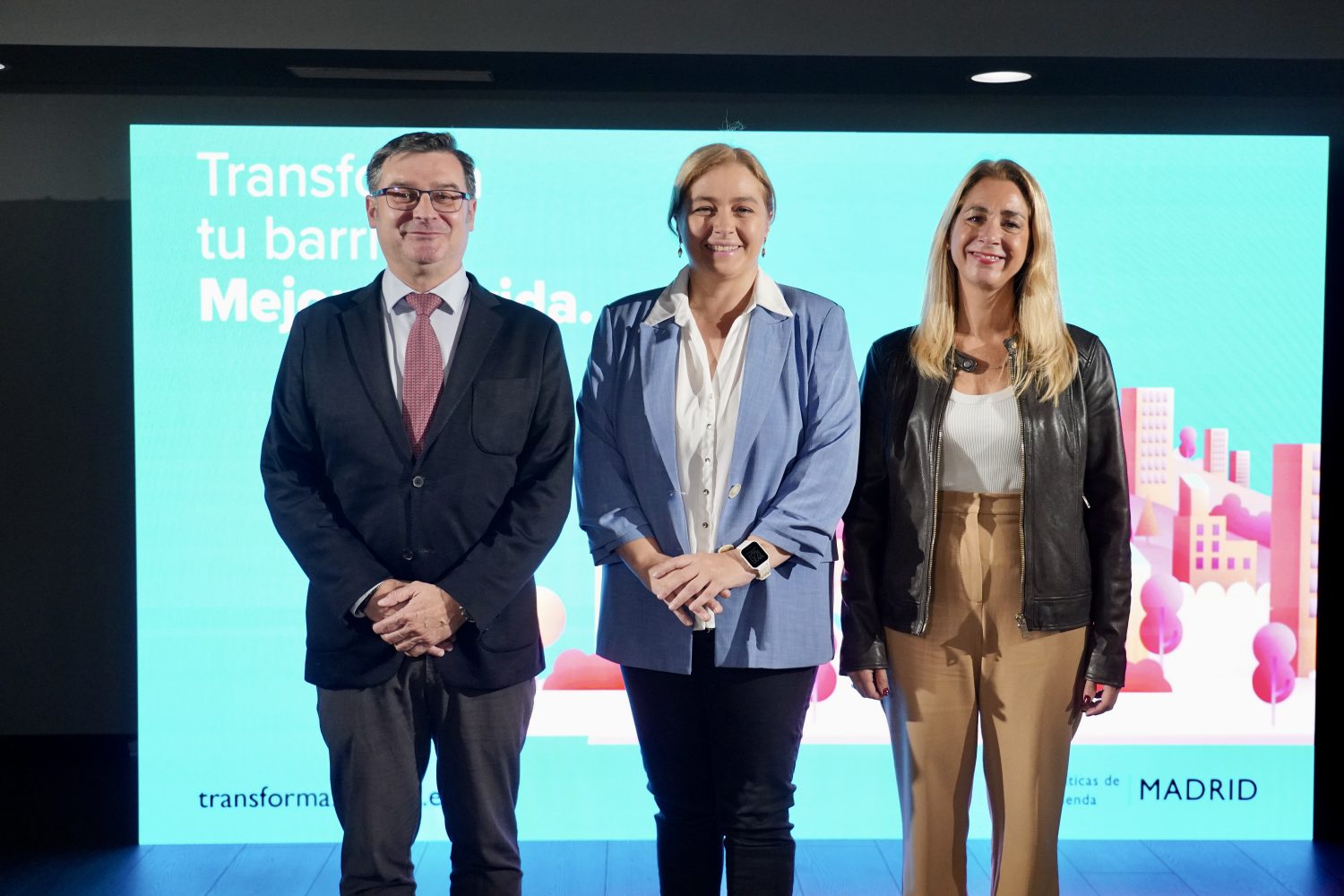 La vicealcaldesa y portavoz municipal, Inma Sanz, y el delegado de Políticas de Vivienda, Álvaro González, acompañados de la concejala del distrito de Ciudad Lineal, Nadia Álvarez, han presentado esta mañana el Plan Transforma Tu Barrio 2023 que destina 2,4 millones de euros a ayudas económicas para fomentar la mejora de las condiciones de accesibilidad, salubridad, eficiencia energética y regeneración de los barrios Poblado Dirigido de Orcasitas, Meseta de Orcasitas, ambos en Usera, y San Pascual, en Ciudad Lineal.