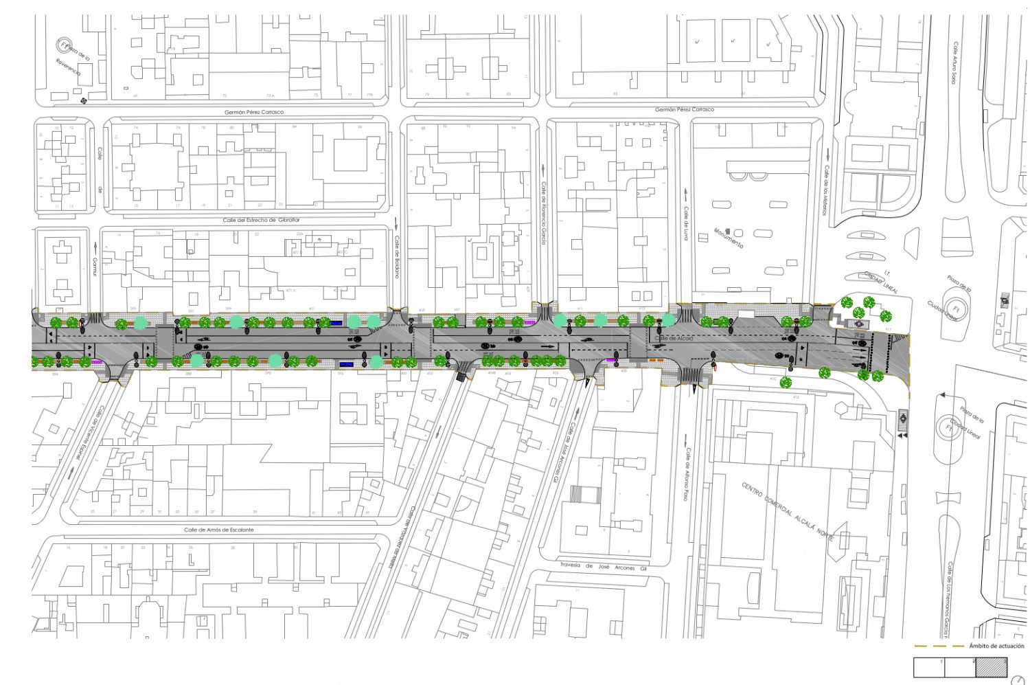 Esta actuación supone una continuación, como segunda fase, de la actuación de remodelación del tramo de la calle de Alcalá entre la Calle 30 y la calle de Argentina, realizada recientemente y de la que se seguirán los mismos criterios estéticos para mantener la homogeneidad.