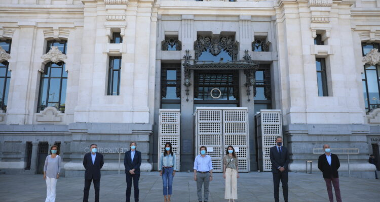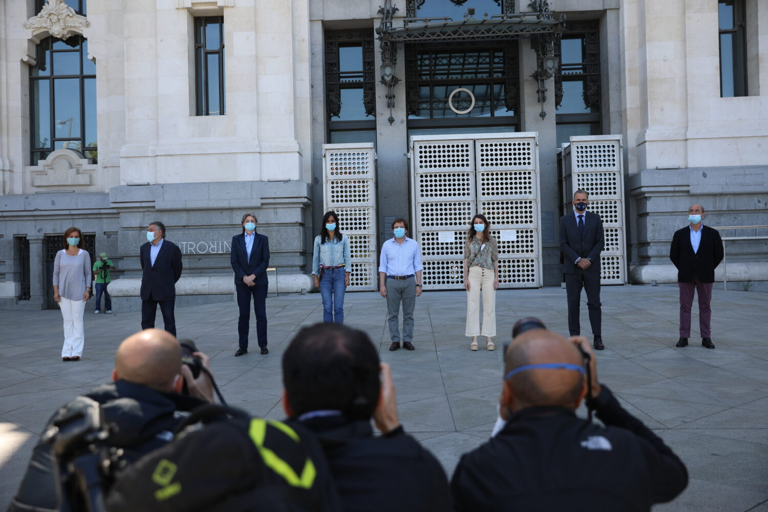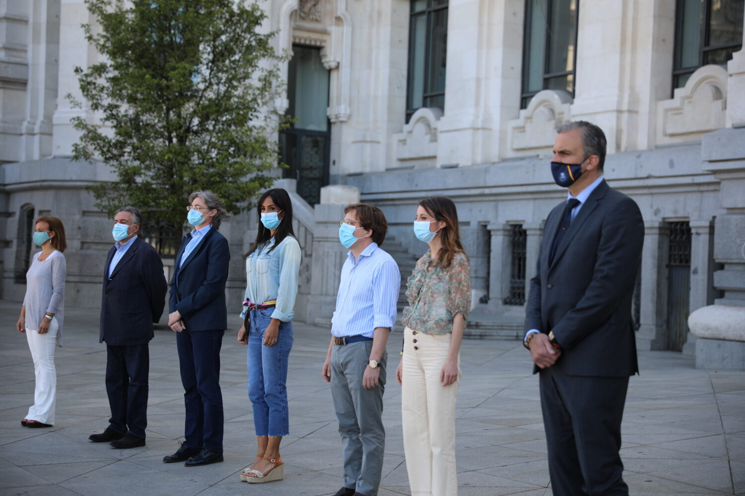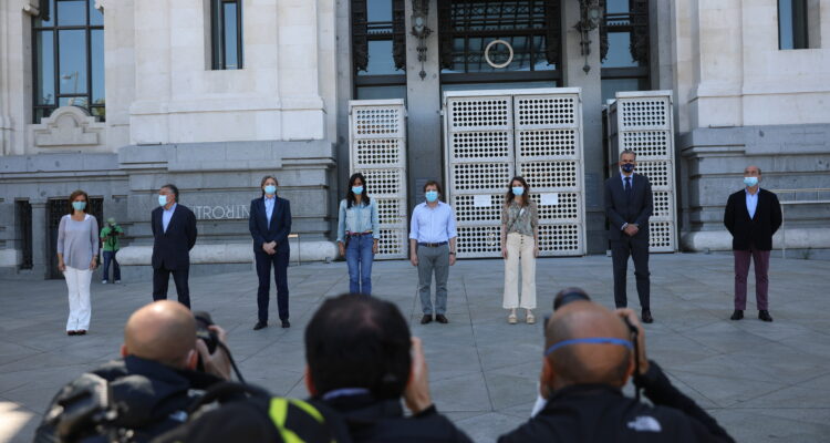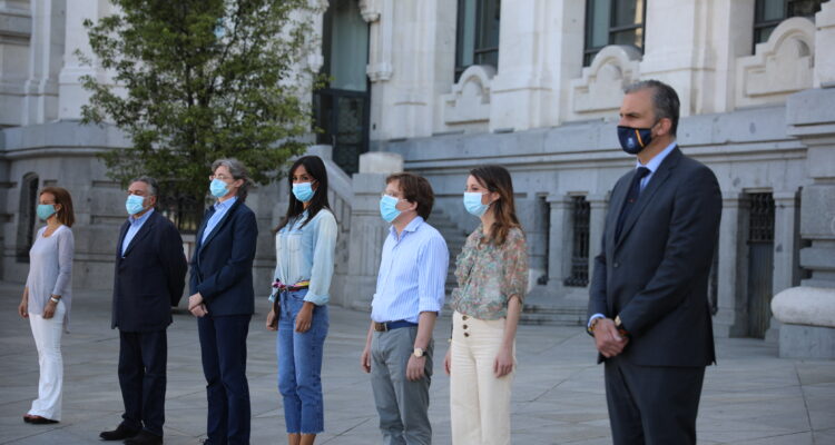 El alcalde de Madrid, José Luis Martínez-Almeida; la vicealcaldesa, Begoña Villacís, y otros miembros del equipo de Gobierno, así como los portavoces de todos los grupos municipales han guardado un minuto de silencio frente a la sede del Consistorio madrileño en la plaza de Cibeles en memoria de las víctimas por el coronavirus.