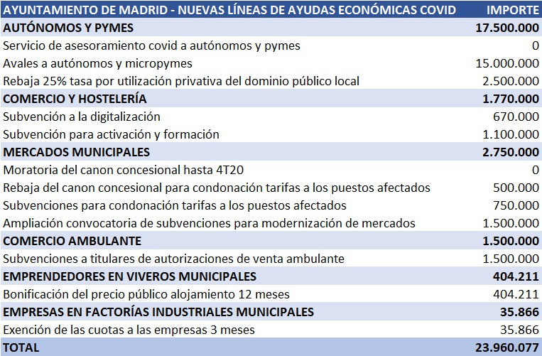 El Ayuntamiento de Madrid, a través del Área de Economía, Innovación y Empleo, ha lanzado hoy un paquete de ayudas a pymes y emprendedores que cuenta con un importe de hasta 24 millones de euros (23.960.077) en forma de avales, subvenciones, moratorias y rebajas en tasas, según ha anunciado la vicealcaldesa, Begoña Villacís, en la rueda de prensa posterior a la Junta de Gobierno.
