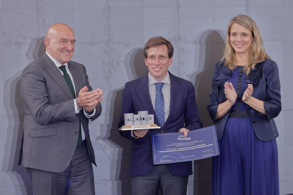 El alcalde de Madrid, José Luis Martínez-Almeida, ha recogido hoy en Valladolid el Reconocimiento Institucional que CEOE Valladolid ha otorgado al Ayuntamiento, un galardón que concede a instituciones o profesionales que destacan por su contribución a la actividad económica y empresarial en sus territorios. El premio reconoce el compromiso de la ciudad de Madrid con el fomento del emprendimiento, la atracción de inversión y la generación de empleo, así como su apuesta por modelos de colaboración entre territorios que refuercen la vertebración y la creación de oportunidades.
