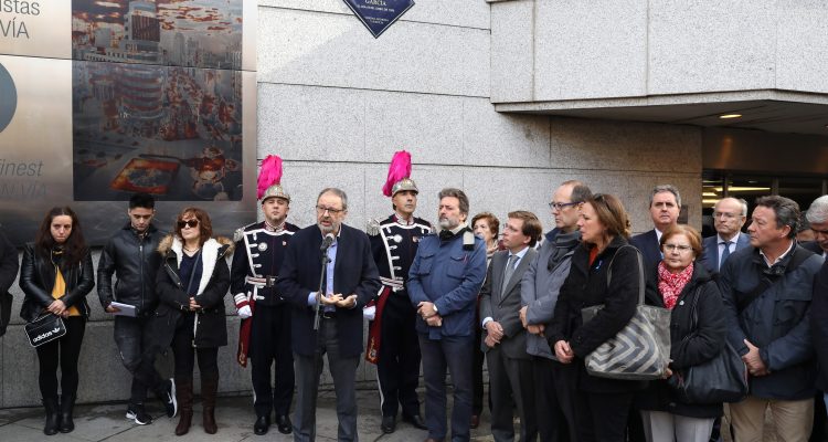 Con la colocación de esta placa, el Ayuntamiento de Madrid cumple con un acuerdo del Pleno de 28 de mayo de 2014, según el cual la corporación decidió por unanimidad colocar placas conmemorativas en lugares de la ciudad de Madrid en los que se hubieran producido atentados terroristas con resultado de muerte.