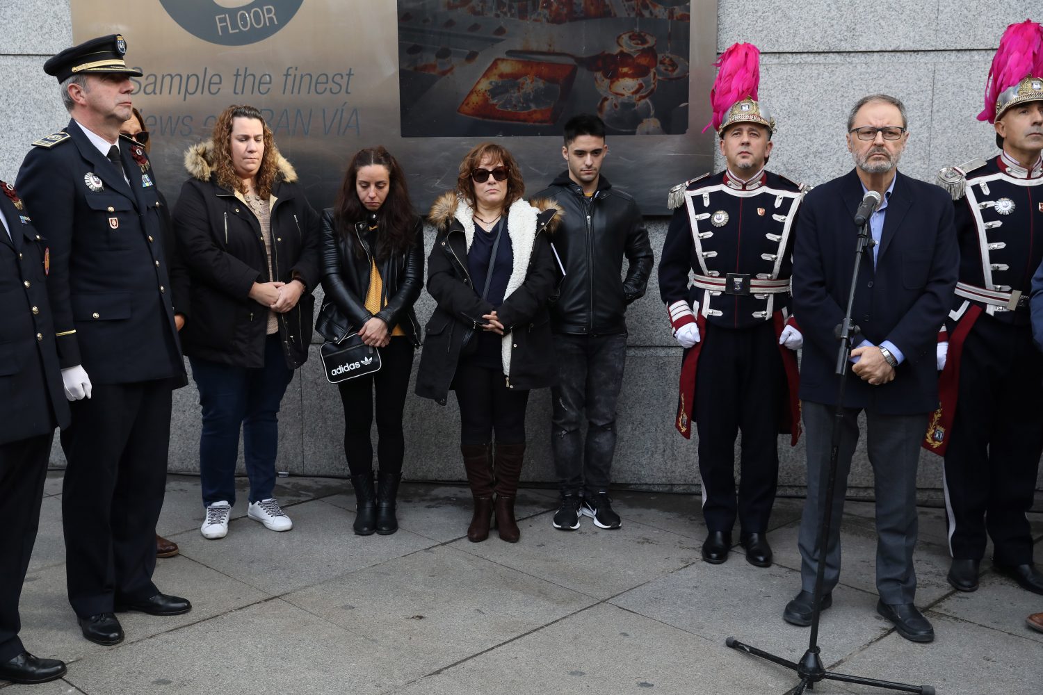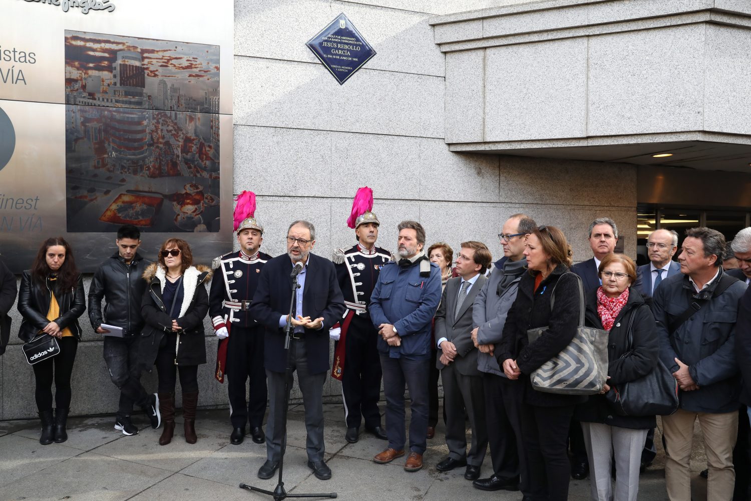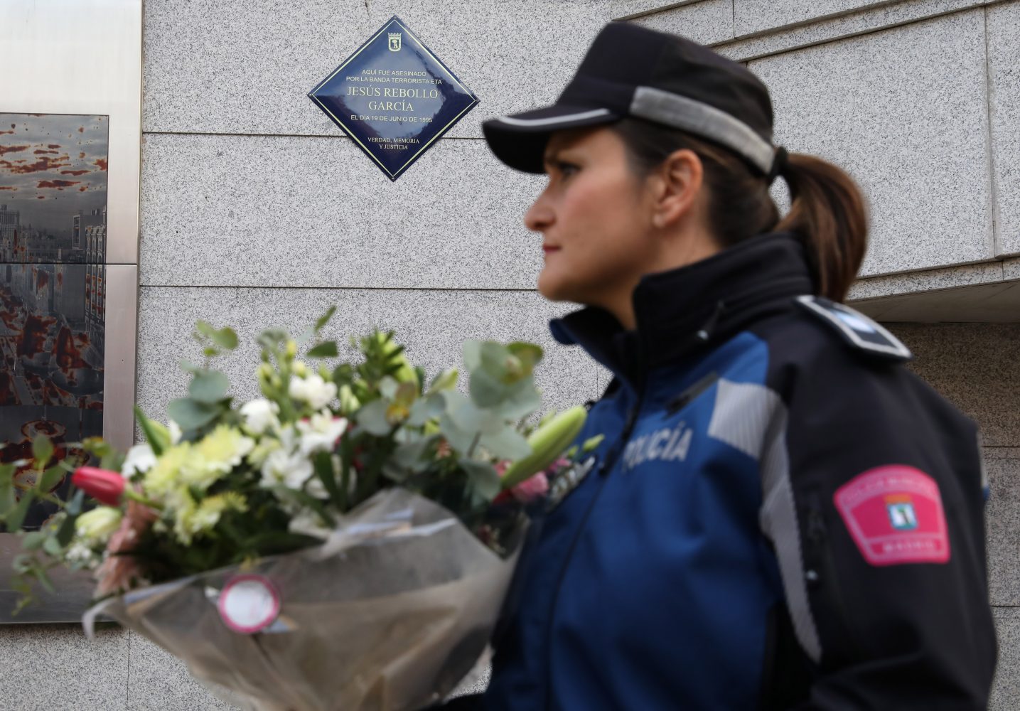 El delegado del Área de Salud, Seguridad y Emergencias, Javier Barbero, acompañado del Comisario General de Policía Municipal, Teodoro Pérez, y de una amplia representación del Cuerpo de Policía Municipal, han descubierto hoy una placa en homenaje al policía municipal, Jesús Rebollo, asesinado por ETA en junio de 1995. En el acto también ha participado el tercer teniente de alcalde del Ayuntamiento de Madrid, Mauricio Valiente.