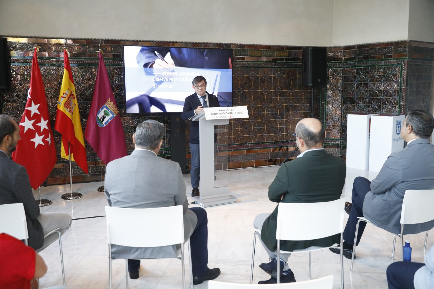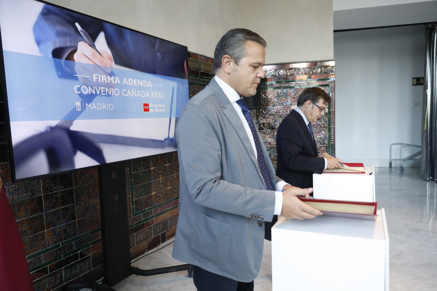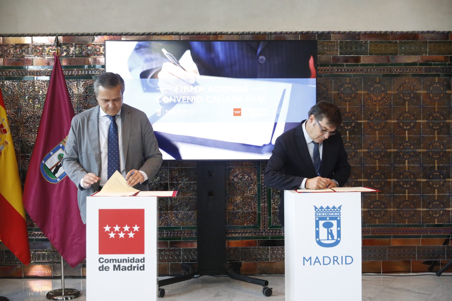 El delegado del Área de Políticas de Vivienda y presidente de la Empresa Municipal de la Vivienda y Suelo, Álvaro González, ha firmado esta mañana con el consejero de Vivienda, Transportes e Infraestructuras de la Comunidad de Madrid, Jorge Rodrigo, un acuerdo para ampliar el ámbito de aplicación territorial de los realojos de las familias de la Cañada Real que se vienen llevando a cabo en los últimos años. El objetivo principal, según González, es “ofrecer la mejor solución a estas familias, darles unas condiciones mejores e ir eliminando este problema que tenemos a lo largo del sector 6 de la Cañada Real y seguir avanzando en la eliminación de la Cañada Real tal y como la conocemos”.
