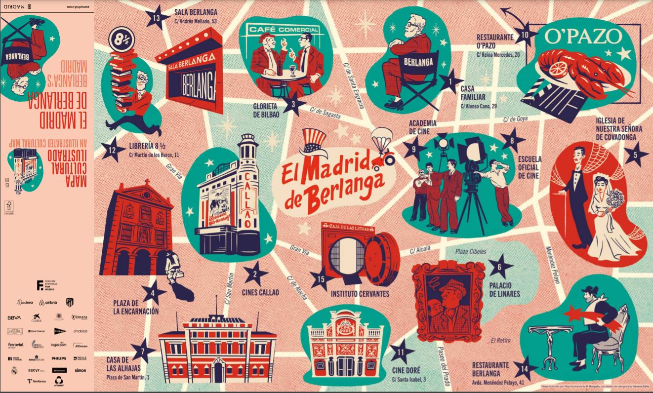Editado en español e inglés a través de la empresa municipal Madrid Destino, el mapa descubre los edificios y las calles que marcaron la vida del cineasta valenciano en Madrid. Luis Alegre, autor del libro ¡Hasta siempre, Mister Berlanga! publicado en 2020 junto al ilustrador El Marqués, afirma que “Berlanga adora el Madrid de los tugurios nocturnos y el de los cafés y tertulias. En su cine cobra un gran protagonismo el Madrid de la posguerra en Esa pareja feliz, el Madrid del desarrollismo en El verdugo, el del tardofranquismo en La escopeta nacional y el de la transición en Patrimonio nacional y Nacional III”.