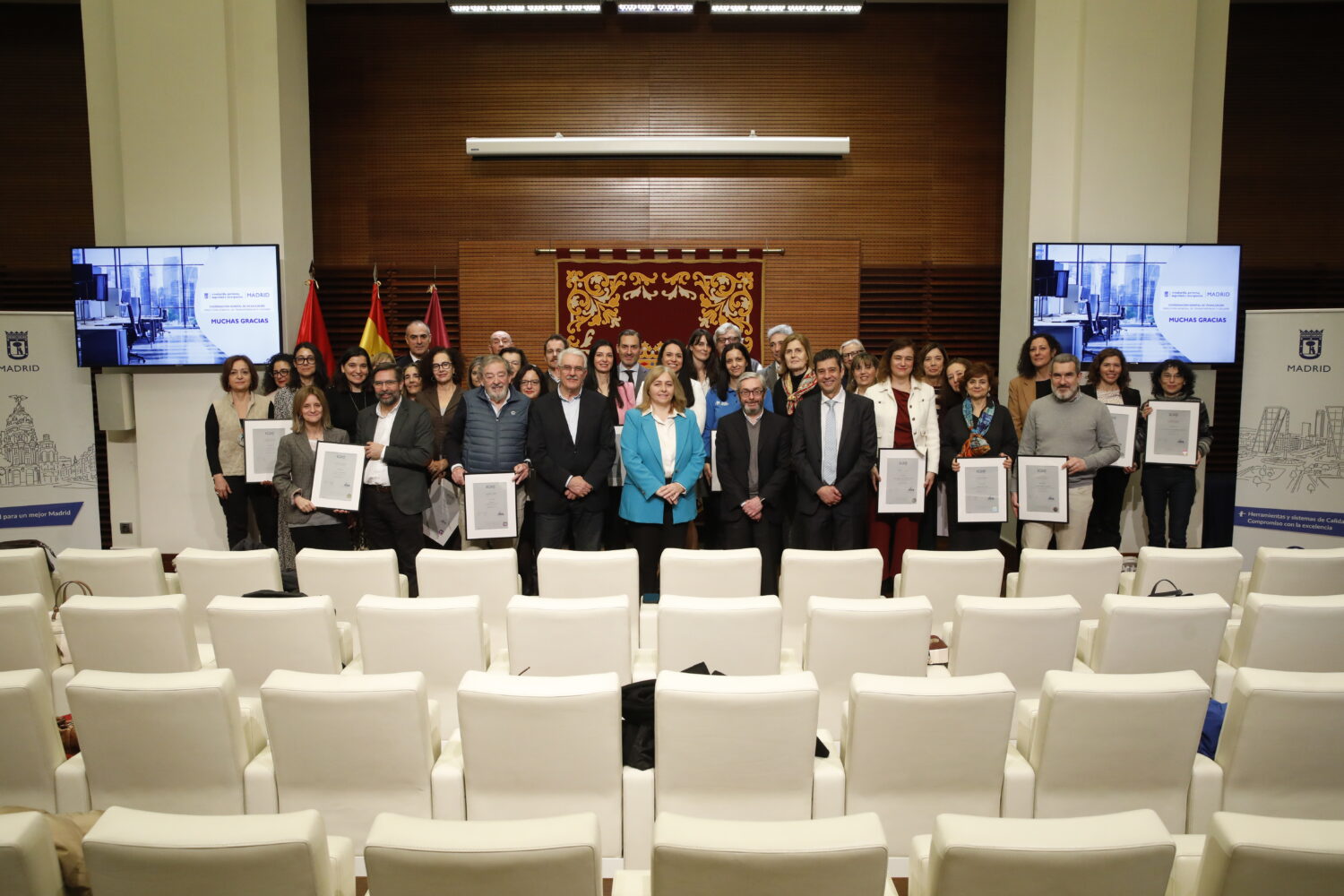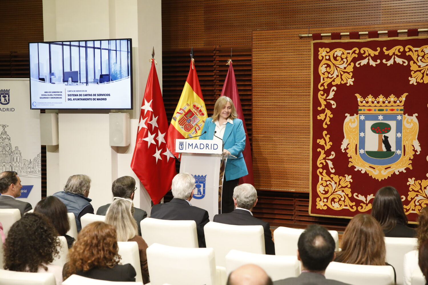 Acto de entrega de certificaciones de calidad de 26 cartas de servicios del Ayuntamiento de Madrid en el salón de actos del Palacio de Cibeles