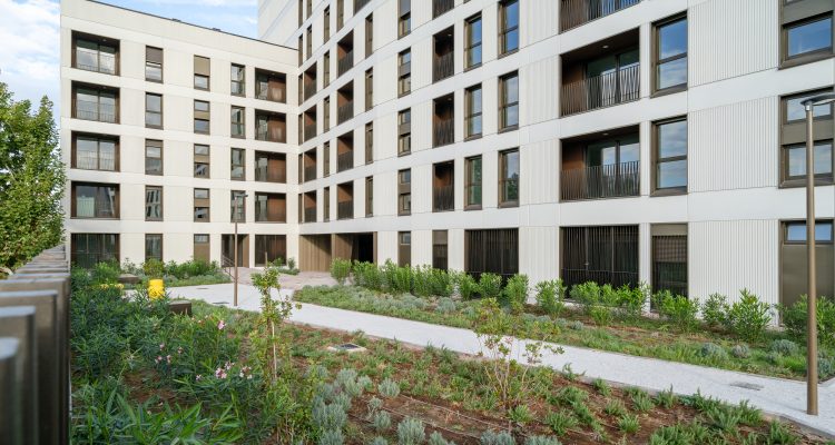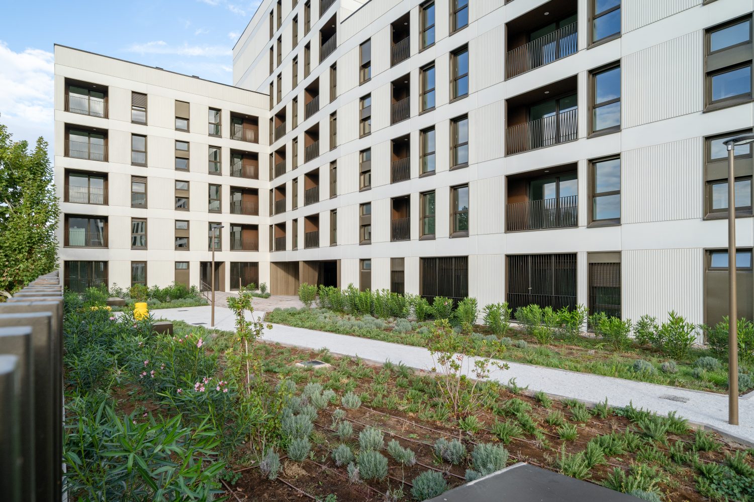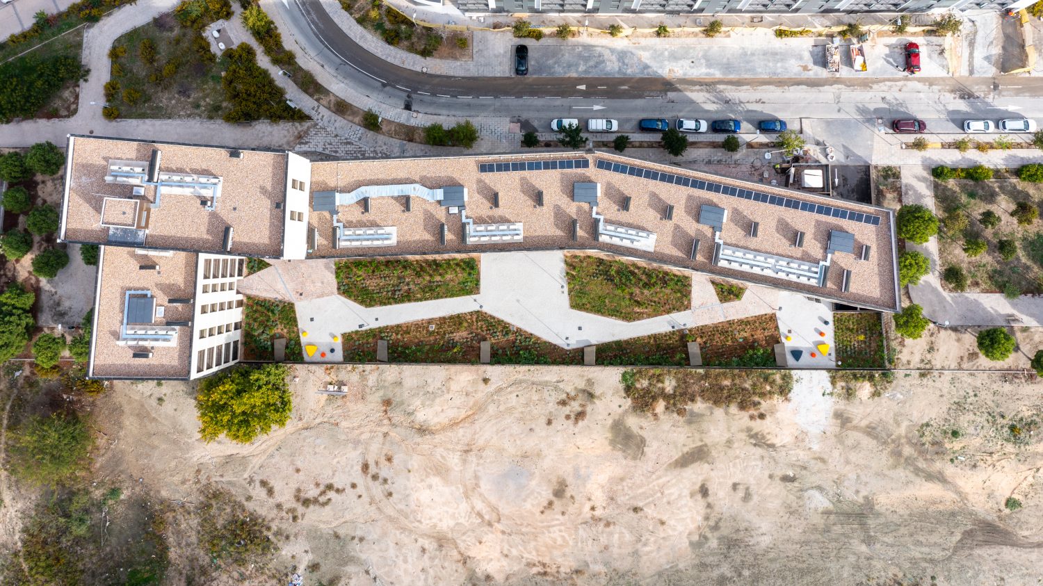 Otro de los aspectos esenciales del proyecto son las zonas comunes. Orientadas al sur, se han diseñado mediante grandes porches y accesos y una gran área verde para disfrute de los inquilinos, con vegetación autóctona de baja exigencia hídrica y bajo mantenimiento. Además, el 70 % de su superficie es permeable y cuenta con depósitos que recogen el agua de la lluvia y la reciclan para el riego del jardín.