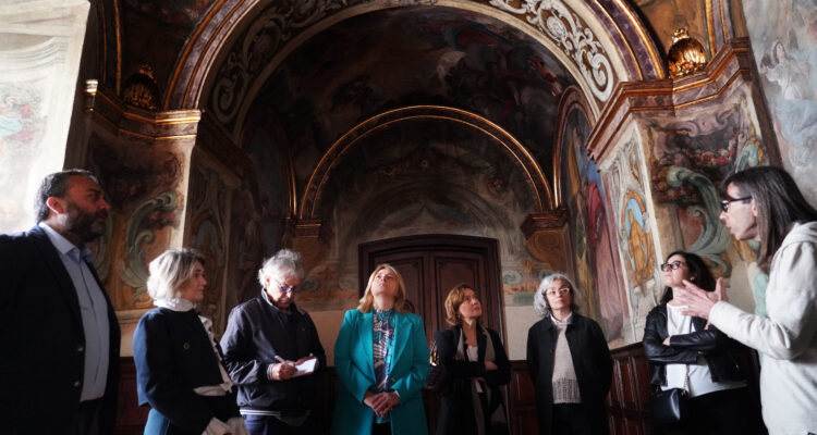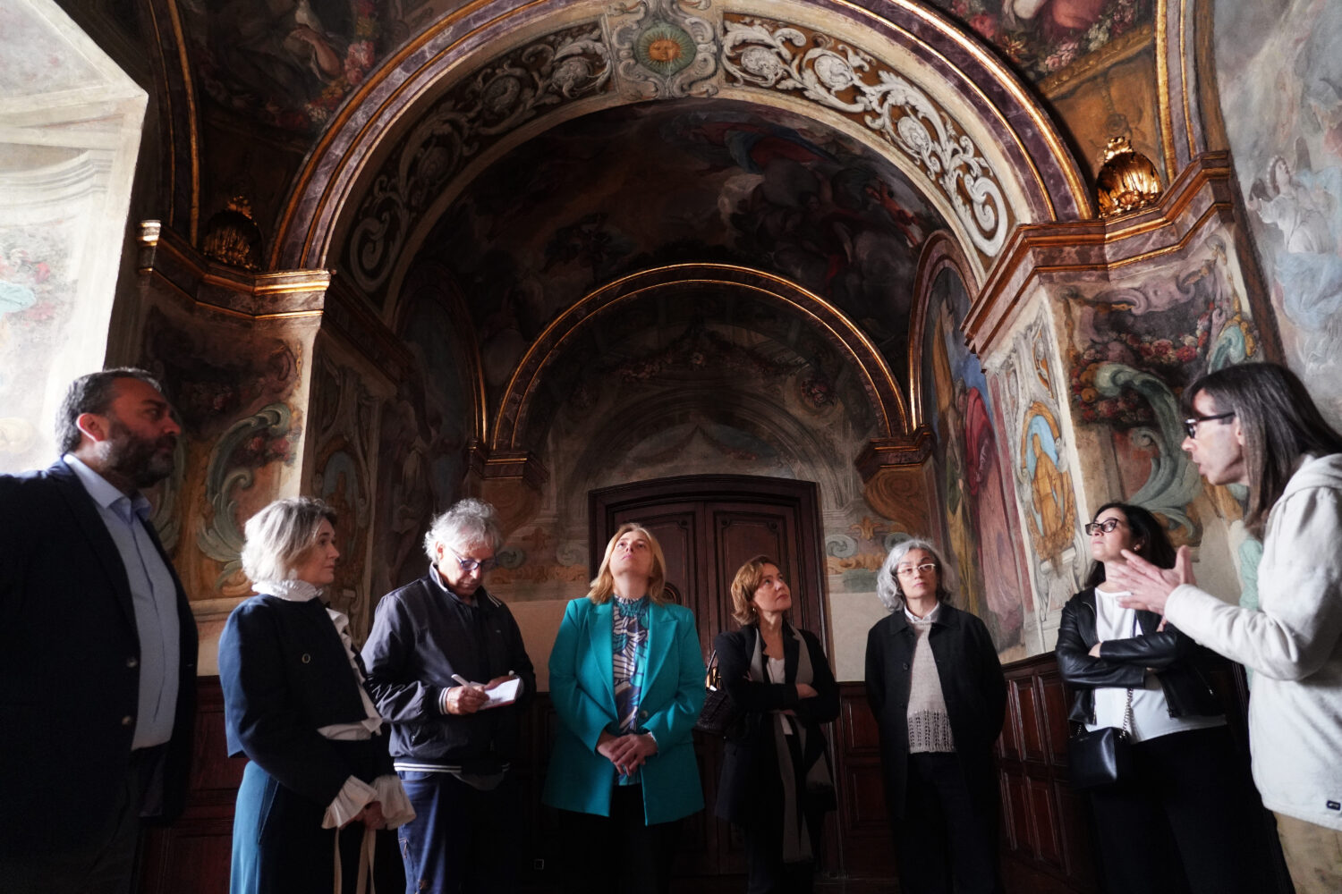Sanz y Rivera durante la visita a los trabajos de restauración de los frescos del Oratorio de la Casa de la Villa