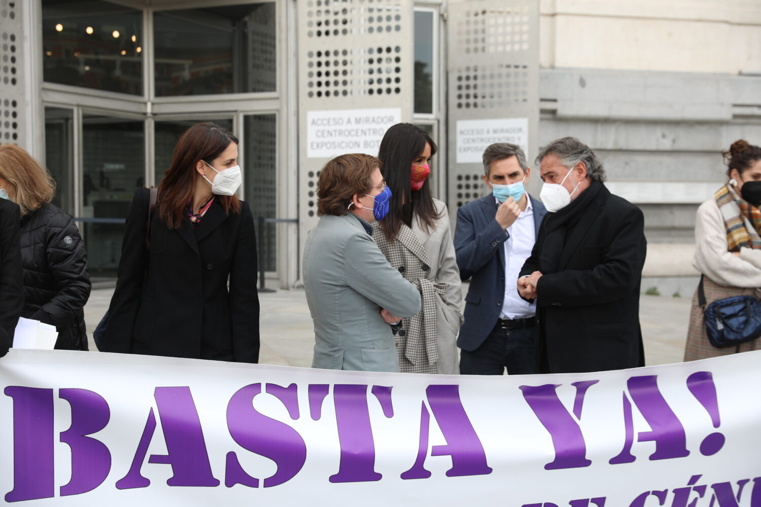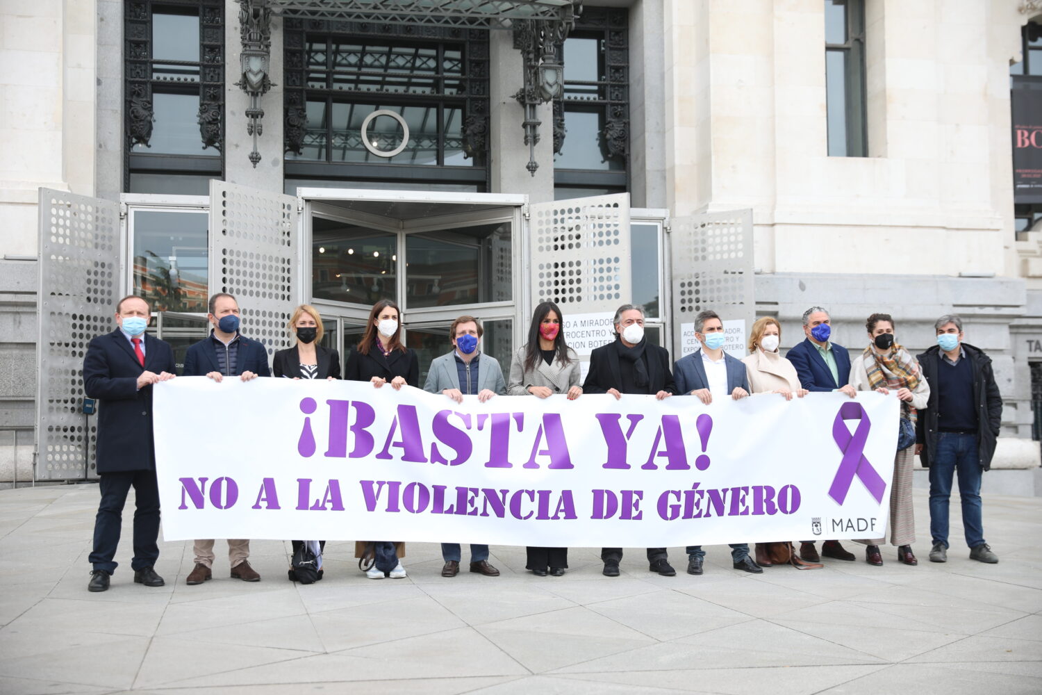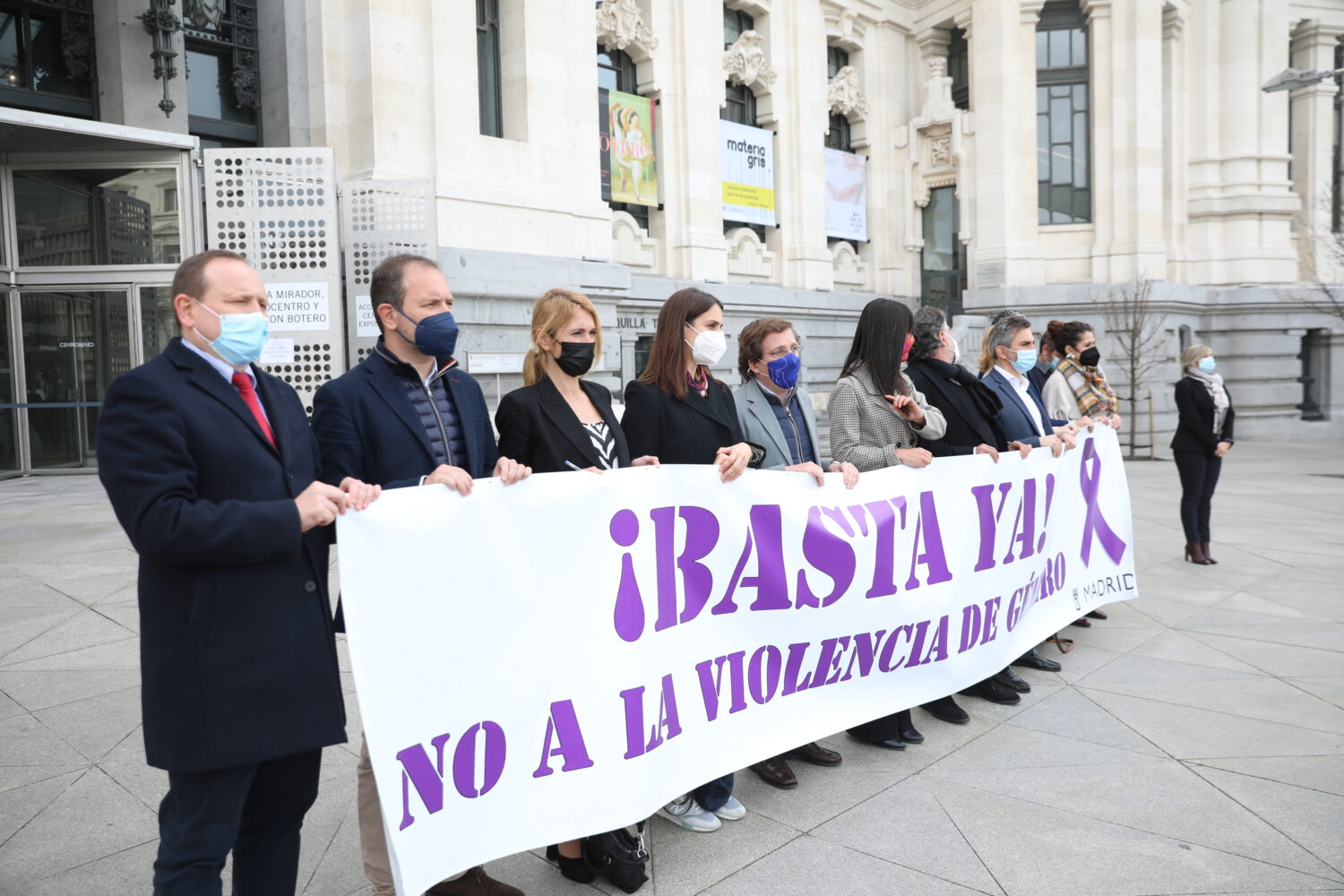 El alcalde de Madrid, José Luis Martínez-Almeida; la vicealcaldesa, Begoña Villacís, miembros del equipo de Gobierno y representantes de los grupos municipales han guardado este mediodía un minuto de silencio en la plaza de Cibeles como muestra de repulsa y condena por el asesinato por violencia de género de una mujer de Majadahonda el pasado 14 de febrero.