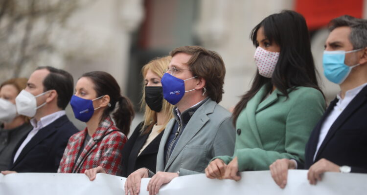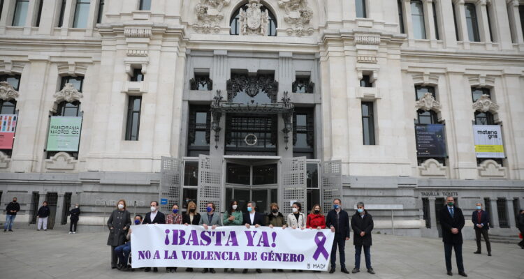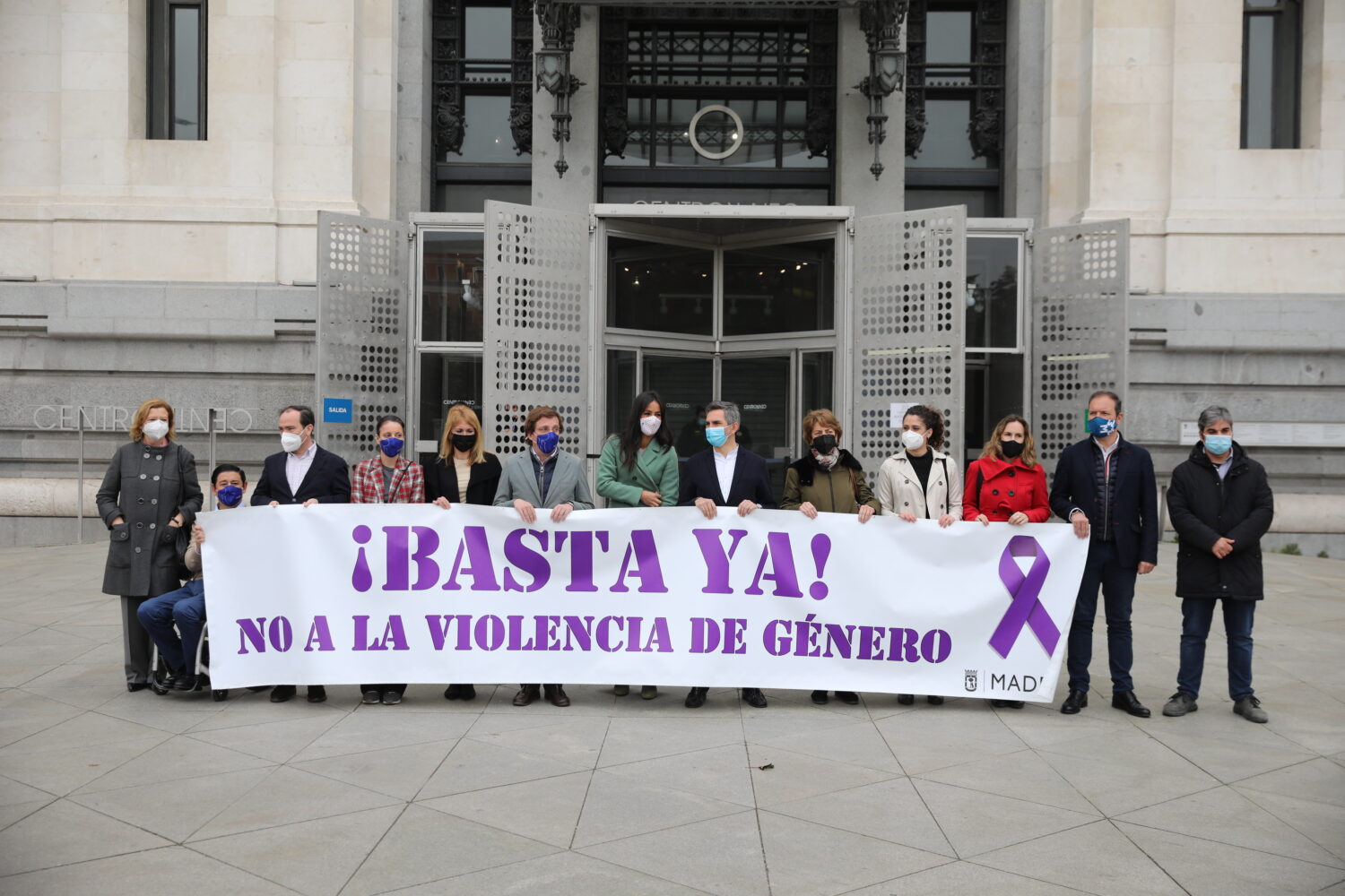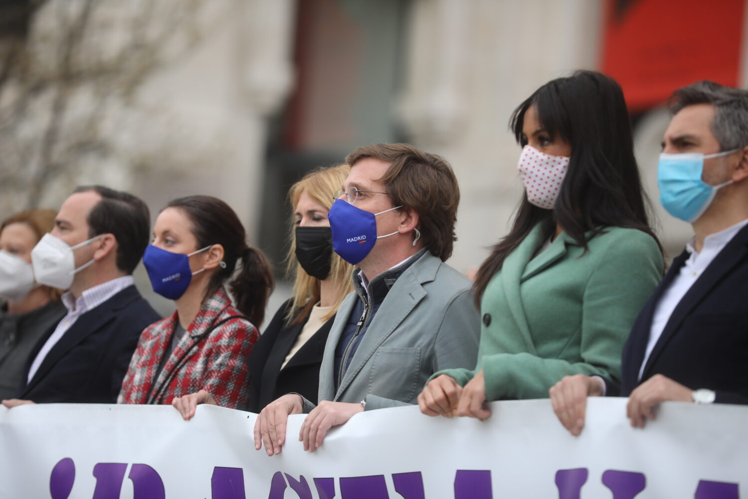 El alcalde de Madrid, José Luis Martínez-Almeida; la vicealcaldesa, Begoña Villacís, miembros del equipo de Gobierno y representantes de los grupos municipales han guardado este mediodía un minuto de silencio en la plaza de Cibeles como muestra de repulsa y condena por el asesinato, presuntamente por violencia de género, de una mujer de Torrejón de Ardoz el pasado 2 de marzo.