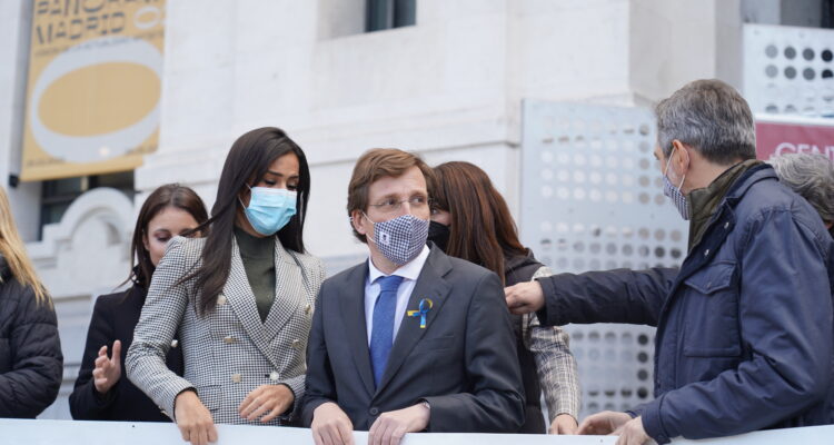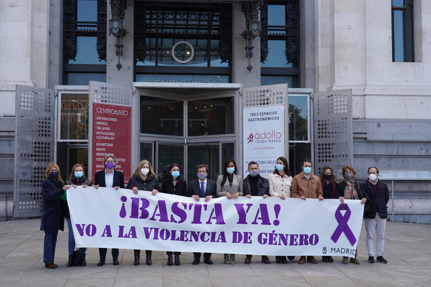 El alcalde de Madrid, José Luis Martínez-Almeida, junto a la vicealcaldesa, Begoña Villacís, miembros del Gobierno municipal y representantes de los grupos políticos municipales, ha guardado este mediodía un minuto de silencio frente a la sede del Ayuntamiento de Madrid, en la plaza de Cibeles, como muestra de repulsa y condena por el asesinato, presuntamente por violencia de género, de una vecina de Pozuelo de Alarcón el pasado miércoles, 2 de marzo.