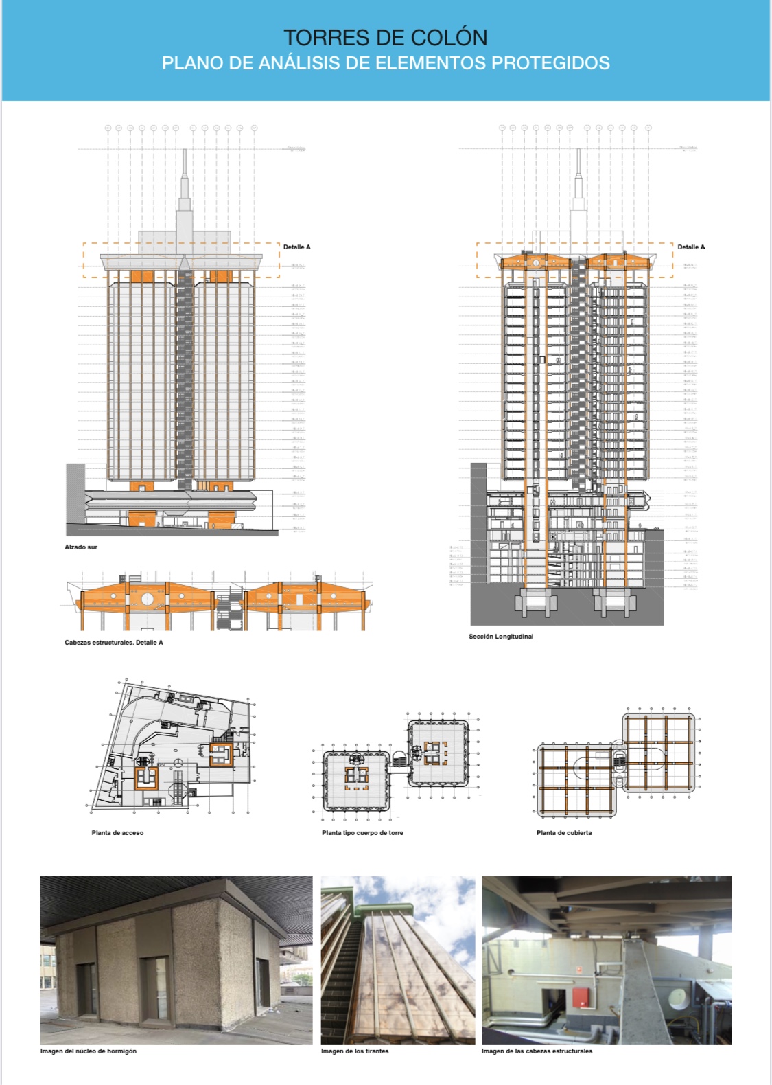 Se considera que el valor digno de protección de las Torres de Colón reside en su estructura ‘colgada’ o ‘suspendida’, que se representa físicamente en la cabeza, los tirantes y el fuste o núcleo central de ambas construcciones. Por lo tanto, en el caso de las obras que se lleven a cabo, esos son los elementos arquitectónicos que se deben mantener y restaurar obligatoriamente. Sin embargo, esta estructura ‘colgada’ que se protege no está ligada a la forma, volumen o materiales del edificio.