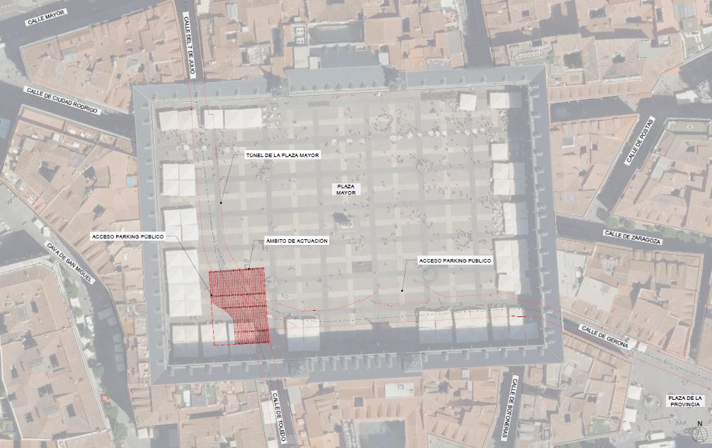 La intervención contempla actuaciones tanto en el interior del túnel como en una zona acotada de unos 400 m2 en la superficie de la plaza Mayor, concretamente en su sector suroeste, al que hay que sumar un espacio vallado para el acopio de materiales. En la plaza se retirarán los adoquines, se demolerá la losa actual y se sustituirán las placas alveolares dañadas. Tras ello, se ejecutará una nueva losa de compresión, se aplicará una membrana impermeabilizante y se recolocarán los adoquines originales.