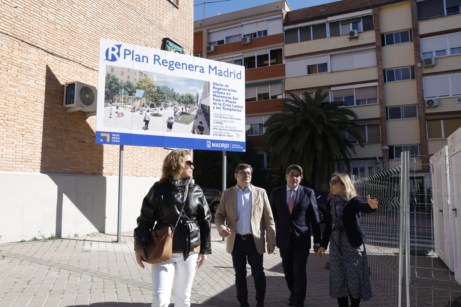 El delegado de Políticas de Vivienda y presidente de la Empresa Municipal de la Vivienda y Suelo de Madrid (EMVS Madrid), Álvaro González, acompañado del concejal de Hortaleza, David Pérez, ha presenciado hoy el inicio de las obras de regeneración urbana del Poblado Dirigido de Manoteras, enmarcadas en el Plan Regenera Madrid. La intervención, que cuenta con una inversión de más de 1,35 millones de euros (1.355.901 euros), se desarrolla en la Unidad de Regeneración Manoteras Sur y abarca una superficie de cerca de 6.000 m2 (5.834), principalmente en las plazas de la Cruz Latina y de los Templarios, así como en las calles de San Pedro de Cardeña y Bacares.