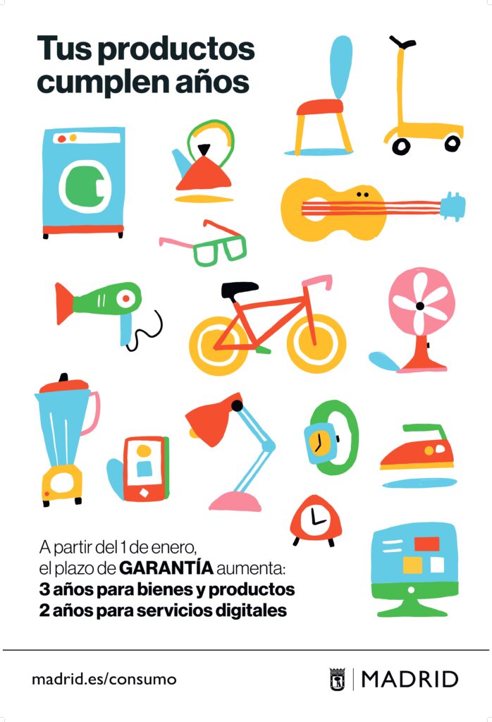 Con el lema ‘Tus productos cumplen años’, el Instituto Municipal de Consumo quiere informar a las personas consumidoras y usuarias del aumento del plazo de garantía a tres años para bienes y productos y a dos años para contenidos y servicios digitales.