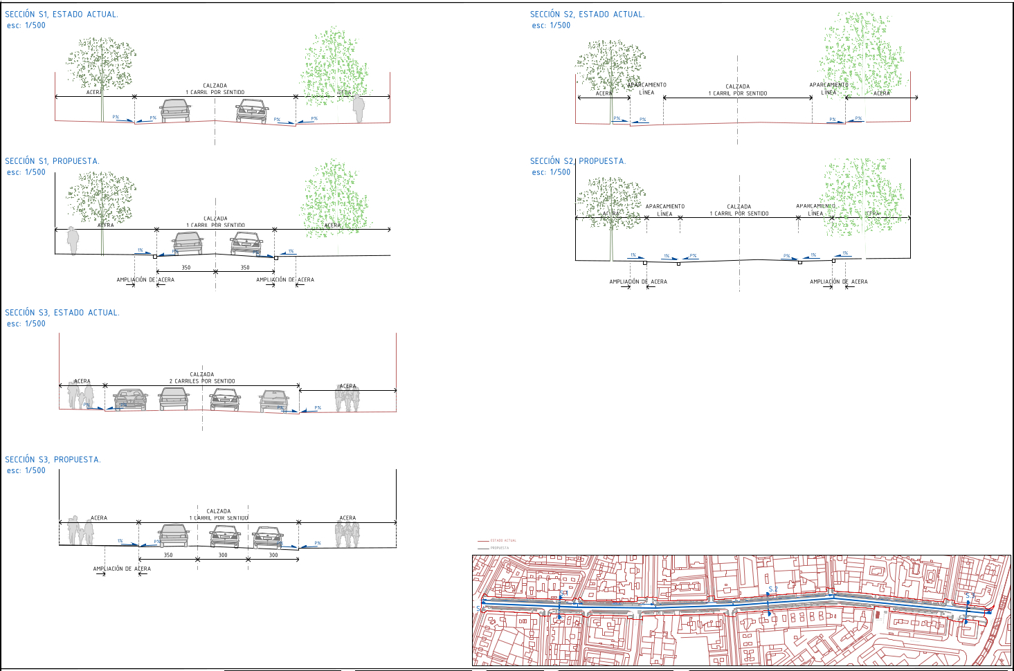Además, la actuación comprende la adaptación y mejora de la red de saneamiento existente, compatible con la nueva ordenación propuesta. La adaptación de elementos viarios también incluye el alumbrado y la red de semaforización, que tendrán que ser renovadas y adaptadas a la nueva alineación fruto de la reestructuración del ancho de las aceras.